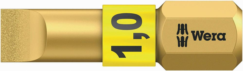 Bits für Schlitzschrauben mit winzigen Diamantpartikeln auf der Bitspitze. Diese sorgen für sicheren Sitz in der Schraube · reduzieren den benötigten Anpressdruck und reduzieren die Gefahr des Abrutschens. Mit Torsionszone · in die bei Belastungsspitzen kinetische Energie abgeleitet wird. Dadurch signifikante Erhöhung der Produktlebensdauer. 1/4″-Sechskant · passend für Halter nach DIN ISO 1173-D 6,3. Vorteile: Für Schlitzschrauben. Mit BiTorsion-Zone zur Abfederung von Belastungsspitzen. Erhebliche Verringerung der Bruchgefahr · deutliche Verlängerung der Lebensdauer. Diamantbeschichtung für sicheren Sitz in der Schraube. 1/4″ Sechskant-Antrieb (Wera Anschluss-Reihe 1). Mit Werkzeugfinder Take it easy: Farbkennzeichnung nach Profilen und Größenstempelung. Bits für Schlitzschrauben mit winzigen Diamantpartikeln auf der Bitspitze. Diese sorgen für sicheren Sitz in der Schraube · reduzieren den benötigten Anpressdruck und reduzieren die Gefahr des Abrutschens. Mit Torsionszone · in die bei Belastungsspitzen kinetische Energie abgeleitet wird. Dadurch signifikante Erhöhung der Produktlebensdauer. 1/4″-Sechskant · passend für Halter nach DIN ISO 1173-D 6,3.