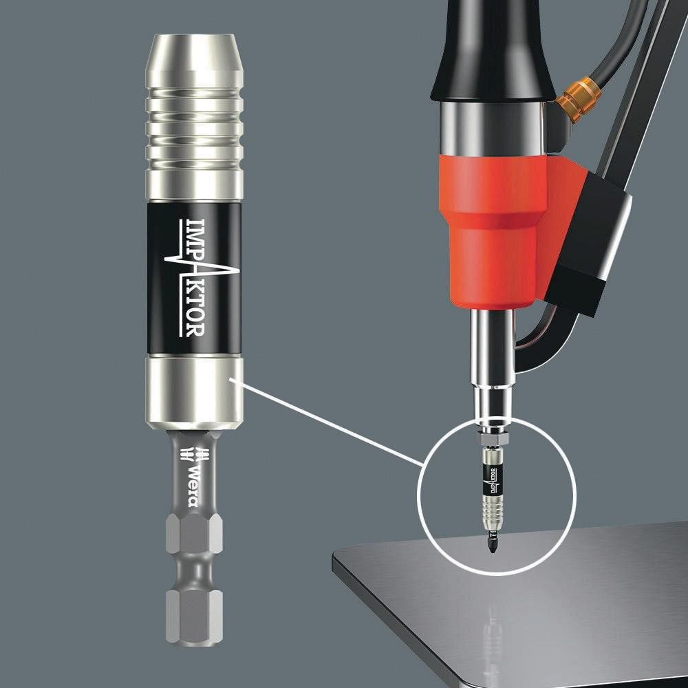 Wera Impaktor Halter zur Abfederung extremer Impulsspitzen. Besonderer Torsionseffekt durch Doppeltorsionsfeder. Der Sprengring garantiert optimalen Sitz des Werkzeugs im Halter. Der Magnet sorgt für zusätzlichen Festsitz von Bit und Schraube. Der Impaktor Edelstahl-Halter mit Sprengring und Magnet wird den extremen dynamischen Anforderungen insofern gerecht · als dass er bewusst auf mechanisch anfälligere Kleinbauteile verzichtet. Einsatz vorwiegend in der industriellen Schraubmontage · z.B. mittels Schraubroboter. Abtrieb: Geeignet für Bits mit 1/4″-Außensechskantantrieb nach DIN ISO 1173-C 6,3. Antrieb: 1/4″-Sechskant · passend für Schraubermaschinen mit Aufnahme nach DIN ISO 1173-F 6,3. Vorteile: Impaktor Halter mit Sprengring und Magnet für Bits mit 1/4″ Außensechskantantrieb. Zur Abfederung extremer Impulsspitzen durch Doppeltorsionsfeder. Edelstahlhalter mit Magnet für den sicheren Sitz von Bit und Schraube. Besonders geeignet für den Einsatz mit handelsüblichen Impakt-/Schlagschraubern. Mit 1/4″ Sechskantantrieb. Wera Impaktor Halter zur Abfederung extremer Impulsspitzen. Besonderer Torsionseffekt durch Doppeltorsionsfeder. Der Sprengring garantiert optimalen Sitz des Werkzeugs im Halter. Der Magnet sorgt für zusätzlichen Festsitz von Bit und Schraube. Der Impaktor Edelstahl-Halter mit Sprengring und Magnet wird den extremen dynamischen Anforderungen insofern gerecht · als dass er bewusst auf mechanisch anfälligere Kleinbauteile verzichtet. Einsatz vorwiegend in der industriellen Schraubmontage · z.B. mittels Schraubroboter. Abtrieb: Geeignet für Bits mit 1/4″-Außensechskantantrieb nach DIN ISO 1173-C 6,3. Antrieb: 1/4″-Sechskant · passend für Schraubermaschinen mit Aufnahme nach DIN ISO 1173-F 6,3.