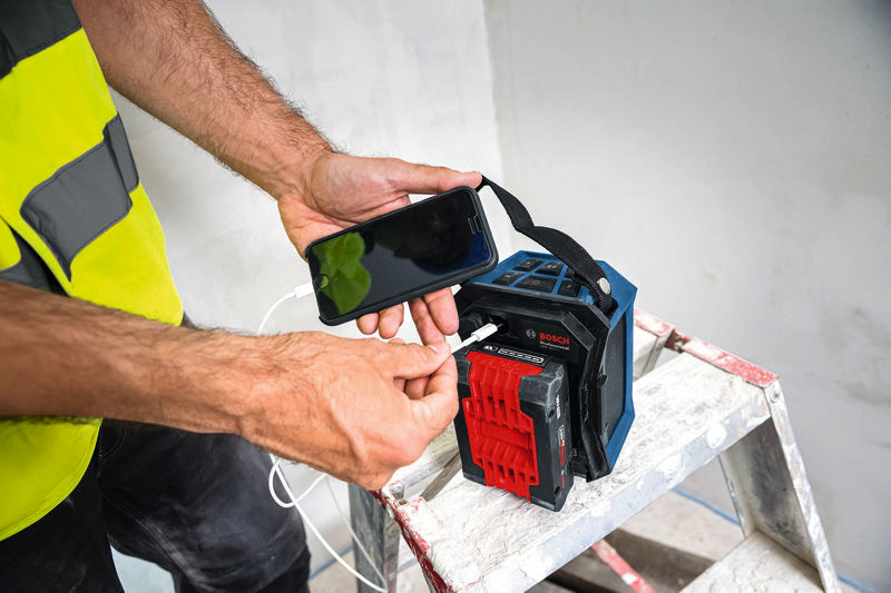 Bluetooth®-Lautsprecher GPB 18V-1 C, Erfülle deinen Arbeitsplatz mit den guten Vibes deiner Lieblingsmusik. Unser Bluetooth®-Lautsprecher GPB 18V-1 C Professional liefert ausgezeichneten, kristallklaren Klang über Bluetooth® oder Multi-Speaker Sound. Multi-Speaker Sound erlaubt die Verbindung mehrerer kompatibler Geräte und das Teilen von Musik über Bluetooth®. Für zusätzliche Flexibilität sorgen das kompakte Design und der Tragegurt für einfachen Transport und einfache Aufbewahrung des Lautsprechers. Einfach einzurichten und mit einem praktischen USB-C®-Ladeanschluss ausgestattet zum Beispiel für Smartphones ist dieser Bluetooth-Lautsprecher wirklich einfach zu bedienen. Kompatibel mit dem Bosch Professional 18V System und dem markenübergreifenden Akkusystem AMPShare. Der Lautsprecher kann mit einem USB-C®-Netzteil mit Power Delivery (PD) betrieben werden. Karton