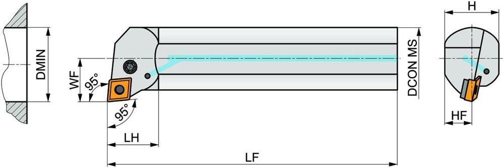 Dreh-Bohrstange mit Kniehebelklemmung zum spannen von 80° Rhombus negative Wendeschneidplatten mit einem Innenkreisdurchmesser von 9.525mm · 3.18mm Dick (ISO Bezeichnung CN.. 0903.. ) · rechte Ausführung zum 95° Stirn-und Längsdrehen mit abgesetzem Schaft · Stahl mit Kühlkanalbohrung · 16mm Durchmesser x 150mm Länge für Innenkegeldrehen und Längsdrehen mit und ohne Schulter