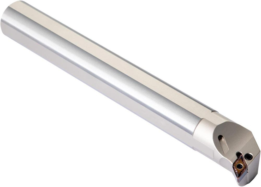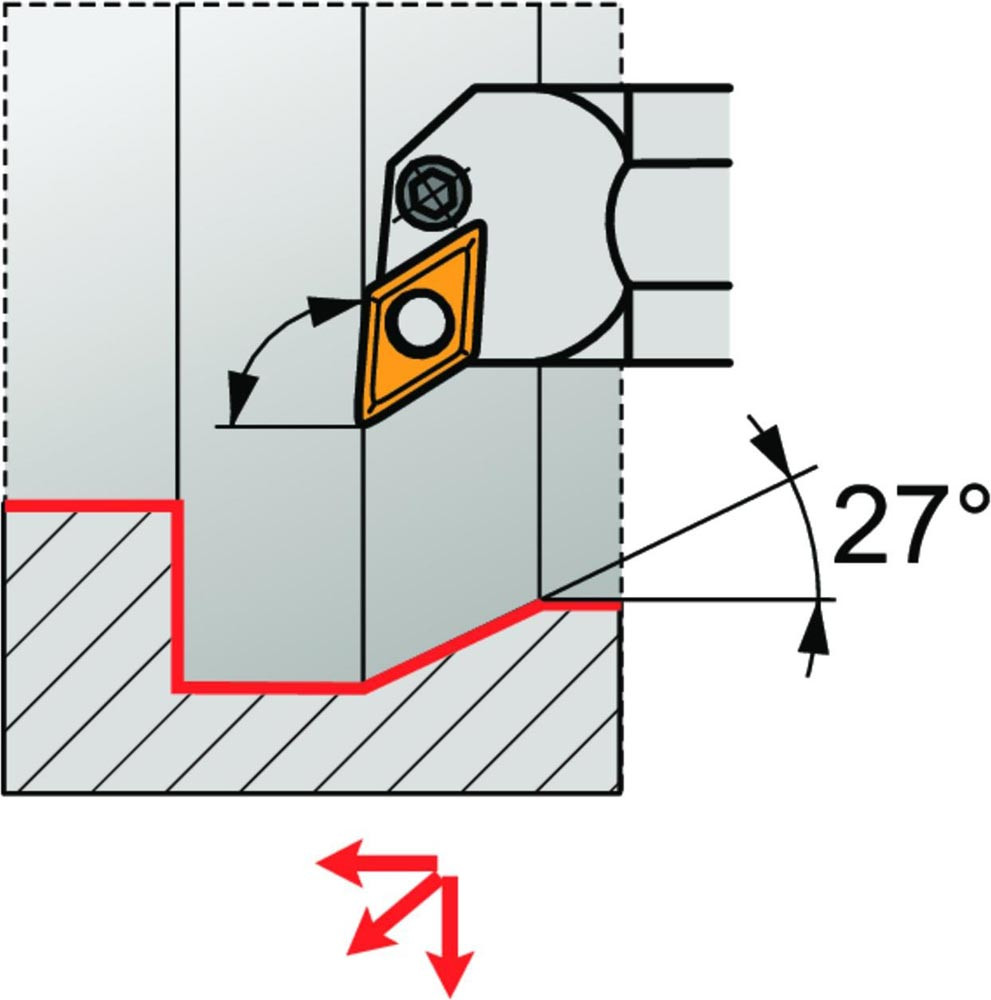 Dreh-Bohrstange mit Kniehebelklemmung zum spannen von 55° Rhombus negative Wendeschneidplatten mit einem Innenkreisdurchmesser von 9.525mm · 4.76mm Dick (ISO Bezeichnung DN.. 1104.. ) · linke Ausführung zum 93° Längsdrehen mit abgesetzem Schaft · Stahl ohne Kühlkanalbohrung · 25mm Durchmesser x 200mm Länge für Innenkegeldrehen · Kopierdrehen in einer und mehreren Richtungen und Längsdrehen mit und ohne Schulter