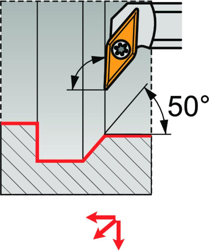 Dreh-Bohrstange mit Schraubklemmung zum spannen von 35° Rhombus positive Wendeschneidplatten mit einem Innenkreisdurchmesser von 7.94mm · 3.18mm Dick (ISO Bezeichnung VC.. 1303.. ) · linke Ausführung zum 93° Längsdrehen mit abgesetzem Schaft · Stahl mit Kühlkanalbohrung · 25mm Durchmesser x 300mm Länge für Kopierdrehen in einer und mehreren Richtungen und Rückwärtsentgraten
