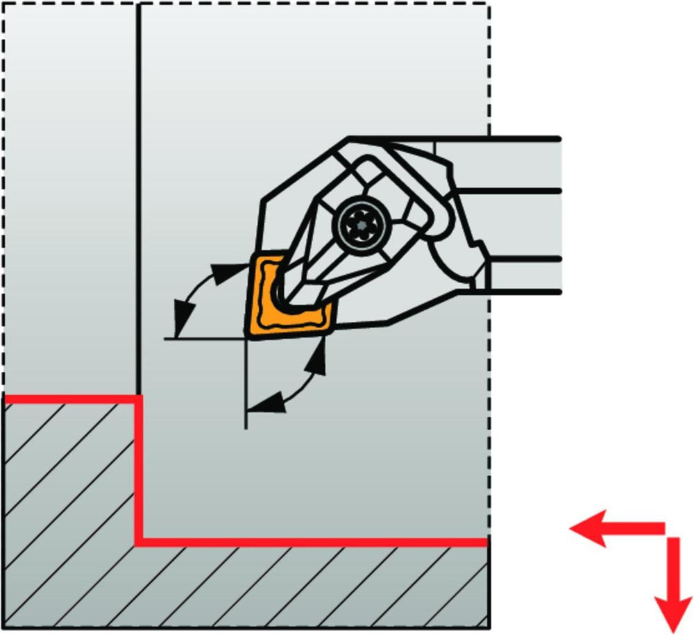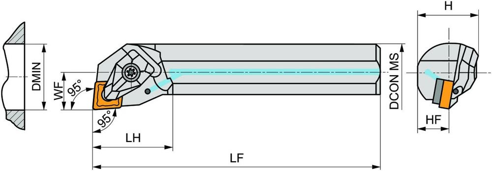 Dreh-Bohrstange doppelt geklemmt zum spannen von 80° Rhombus negative Wendeschneidplatten mit einem Innenkreisdurchmesser von 12.7mm · 4.76mm Dick (ISO Bezeichnung CN.. 1204.. ) · rechte Ausführung zum 95° Stirn-und Längsdrehen mit abgesetzem Schaft · Stahl mit Kühlkanalbohrung · 40mm Durchmesser x 300mm Länge für Innenkegeldrehen und Längsdrehen mit und ohne Schulter