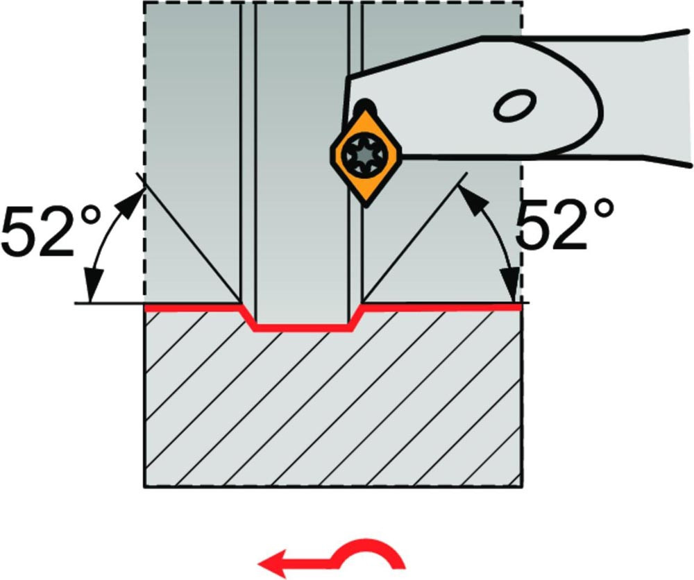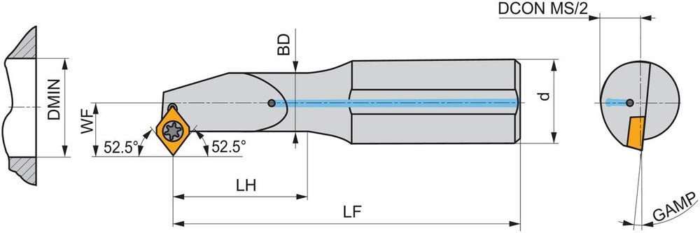 Dreh-Bohrstange mit Schraubklemmung zum spannen von 75° Rhombus positive Wendeschneidplatten mit einem Innenkreisdurchmesser von 5.56mm · 2.38mm Dick (ISO Bezeichnung EP.. 0502.. ) · rechte Ausführung für Sonderanwendungen · Hartmetall mit Kühlkanalbohrung · 8mm Durchmesser x 110mm Länge für Innenkegeldrehen · Kopierdrehen in einer und mehreren Richtungen und Rückwärtsentgraten