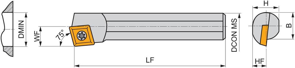 Dreh-Bohrstange mit Schraubklemmung zum spannen von 80° Rhombus positive Wendeschneidplatten mit einem Innenkreisdurchmesser von 9.525mm · 3.97mm Dick (ISO Bezeichnung CC.. 09T3.. ) · rechte Ausführung zum 75° Längsdrehen mit abgesetzem Schaft · Stahl ohne Kühlkanalbohrung · 16mm Durchmesser x 150mm Länge für Innenkegeldrehen und Längsdrehen ohne Schulter