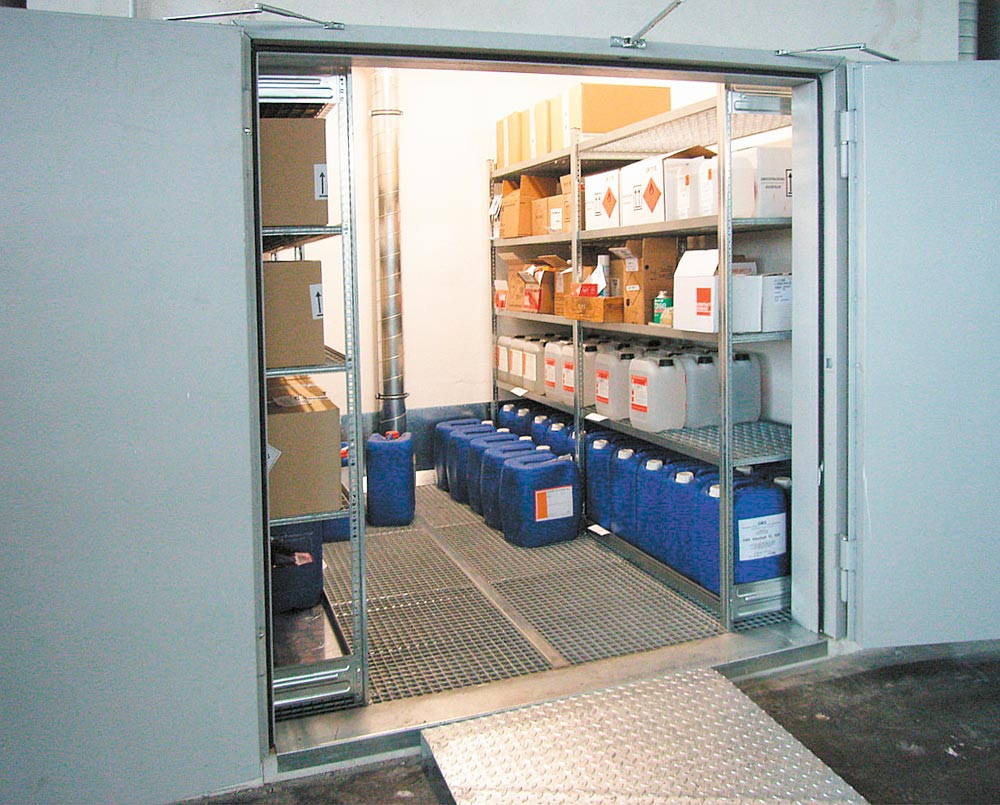 ∙ Zur Lagerung wassergefährdender, entzündbarer, giftiger und sehr giftiger Stoffe ∙ Feuerwiderstandsfähigkeit >90 Minuten ∙ Geeignet zur Innen- und Außenaufstellung ∙ Auffangwanne nach WHG, komplett mit Gitterrostabdeckung, begeh- und handhubwagenbefahrbar ∙ Lackierung RAL 7035 lichtgrau