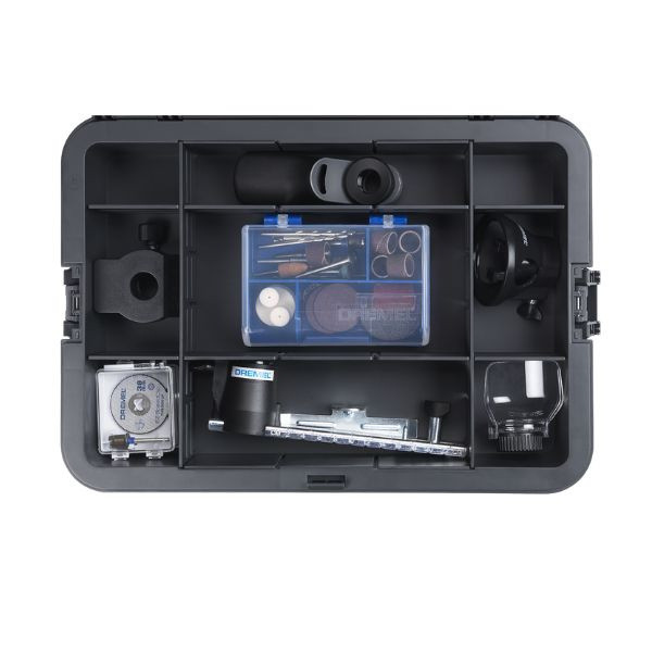 Mobile, lang anhaltende Power. Hole dir die Power des akkubetriebenen Dremel 8240 für Spitzenleistungen. Mit diesem mobilen Kraftpaket hast du alles im Griff. Du bekommst die gleiche Power wie beim kabelgebundenen Dremel 4250, bist aber unabhängig von der Verfügbarkeit von Strom. Klein aber stark: genieße eine lange Laufzeit dank kraftvollem, abnehmbarem 2-Ah-Akku. Für deine Bedürfnisse entwickelt. Der Dremel 8240 wurde für deine Bedürfnisse entwickelt. Vom ergonomischen Werkzeugdesign bis zur Schalterpositionierung: Bei diesem Akku-Multitool wurde an alles gedacht. Haptik und Optik sind typisch Dremel und überzeugen durch einen supereinfachen Aufbau und eine logische Schalteranordnung. Das Werkzeug läuft nun leiser und mit geringerer Temperatur, so dass du all deine Aufmerksamkeit auf dein Projekt richten kannst. Zudem liegt der Softgrip perfekt in der Hand. Die Drehzahlregelung des Dremel 8240 befindet sich in der Mitte, genau dort, wo der Daumen das Werkzeug hält. Ein ergonomisches Design für optimale Handhabung. Der Dremel 8240 besitzt eine Motorbremse, die für mehr Kontrolle und Sicherheit sorgt. Die Motorbremse verlangsamt die Rotation nicht, sondern stoppt sie sofort beim Abschalten des Werkzeugs. Die LED-Anzeige für die Batterielebensdauer, zeigt dir auf einen Blick die verbleibende Akkuladung. Dein Dremel 8240 ist mit einer Aufhängung ausgestattet, so dass du ihn mit der Biegsamen Welle einfach an deinen Dremel Werkzeughalter hängen kannst. Multitool für zahlreiche Anwendungen. Der Dremel 8240 ist ebenso vielseitig wie kraftvoll. Möchtest du trennen, schleifen, schnitzen, gravieren, reinigen oder polieren? Egal welche Arbeit ansteht, dein Dremel 8240 ist einsatzbereit, denn er ist kompatibel mit dem gesamten Sortiment an Dremel Multifunktionswerkzeug-Aufsätzen und -Zubehören. Dazu gehört das EZ SpeedClic System mit seinem revolutionären Zieh-Klick-Dreh-Mechanismus, mit dem du Zubehöre sechsmal schneller wechseln kannst. Außerdem kannst du Dremel MAX-Zubehöre mit deinem Dremel 8240 verwenden. Sie setzen den höchsten Standard hinsichtlich Langlebigkeit und Haltbarkeit. Platinum Perfektion. Umfassende Auswahl an Zubehören und Aufsätzen. Lieferung mit zwei 12-V-2-Ah-Akkus für längere Anwendungszeiten. Mit nicht weniger als 65 Zubehören, inklusive SpeedClic, gelingen dir Schnitzen, Gravieren, Schmirgeln, Schleifen, Reinigen, Polieren, Trennen und weitere Anwendungen auf höchstem Niveau mit größter Präzision. Du erhältst fünf Aufsätze Präzisionshandgriff, Schutzhaubenaufsatz, Modellierungstisch, Kreis- und Parallelschneider und Mehrzweck-Fräsaufsatz die dir maximale Kontrolle, Sicherheit und Genauigkeit geben. Dieses Set kommt in der Dremel Box, einem vielseitigen Aufbewahrungssystem, das an deine Organisationsbedürfnisse angepasst werden kann. Mit verstellbaren Teilern kannst du das Innere ganz nach Wunsch zur Aufbewahrung deiner Werkzeuge, Zubehöre und Vorsätze einrichten. Das Set umfasst zwei stapelbare Boxen, die entweder zur platzsparenden Organisation sicher gestapelt oder separat für eine spezifischere Organisation verwendet werden können. Der integrierte Griff erleichtert den Transport deiner Werkzeuge, wohin auch immer dich deine Projekte führen.