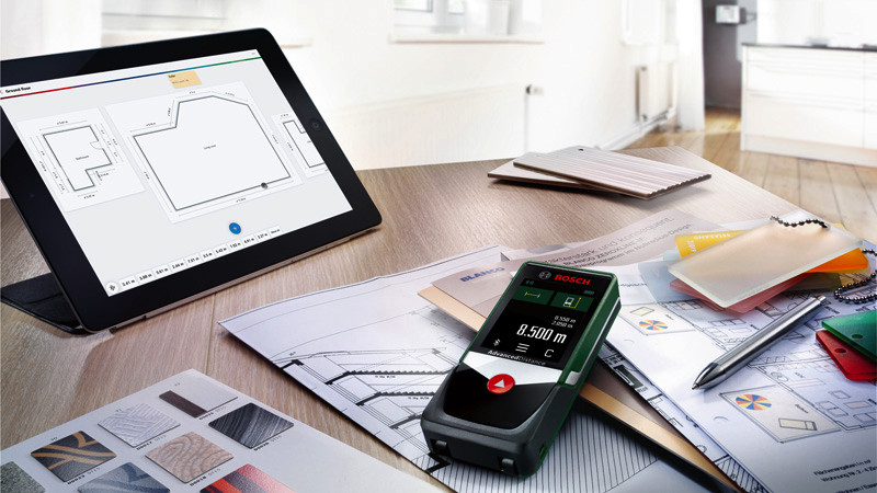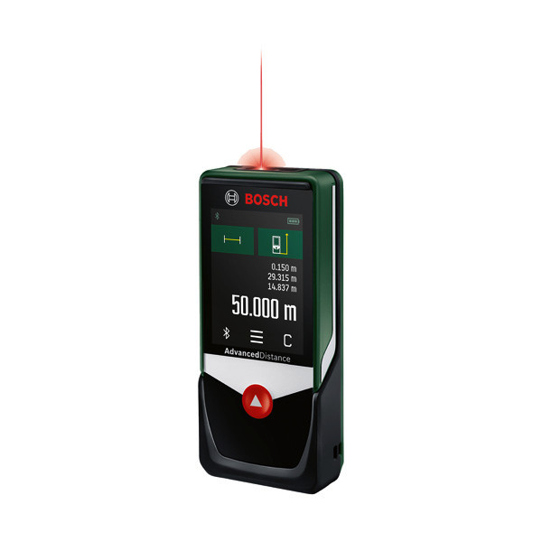 Digitaler Laser-Entfernungsmesser AdvancedDistance 50C. Die intelligente Art zu messen. Lasergenaue Messungen von Entfernungen bis zu 50 m. Touchscreen-Bedienung am hochwertigen Farbdisplay für optimale Handhabung und Lesbarkeit. Alle Standardmessfunktionen integriert einschließlich indirekter Messungen. Animierte Schritt-für-Schritt-Anleitung für jede Funktion. Bluetooth-Konnektivität, um die Ergebnisse zur Bosch App zu übertragen. Produkt mit Nachhaltigkeitsmerkmalen, weitere Informationen siehe unten. 3 x Batterie 1,5V LR03 (AAA). Aufbewahrungshülle. Karton
