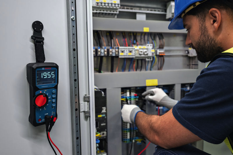 Digitales Multimeter GDM 600-15 + MH 1, Das GDM 600-15 Professional steigert deine Effizienz durch präzise True RMS-Messungen. Das große LCD-Display mit invertierter Anzeige sorgt für klar ablesbare Messwerte bei verschiedenen Anwendungen. Dieses vielseitige Werkzeug misst Frequenz, Durchgang, Widerstand und Kapazität und zeichnet auch Signalschwankungen mit Min/Max/Mittelwert-Messungen auf. Dank Schutzklasse IP65 und langlebigem Design mit Schutz vor Stürzen aus bis zu 2 m Höhe hält es auch rauen Bedingungen auf der Baustelle stand. Und mit einem bequemen Griff, der Ermüdungserscheinungen reduziert, kannst du dich darauf verlassen, dass das GDM 600-15 Professional die benötigte Leistung bietet sogar unter besonders anspruchsvollen Bedingungen. Das GDM 600-15 Professional ist ideal für Elektriker, HLK-Techniker, Facility Manager und Elektrotechniker und erste Wahl für Elektroinstallationen, Wartungen und Reparaturen. Es misst Spannung, Strom und Widerstand in verschiedenen elektrischen Systemen, um sie auf eine einwandfreie Funktion zu prüfen bzw. Fehler zu finden. Das kompakte Design ermöglicht die Einhandbedienung, während ein ausklappbarer Ständer und eine separate Magnetaufhängung die Anwendung erleichtern. Das mit einem Li-Ionen-Akkupack kompatible GDM 600-15 Professional bietet eine lang anhaltende Leistung. Es ist mit einer Messkategorie von CAT III 600 V auf Sicherheit geprüft und enthält zusätzlich hochwertige Messleitungen aus flexiblem, langlebigem Silikon für garantierte Zuverlässigkeit. Dieses kompakte und effiziente Multimeter unterstützt dich bei allen elektrischen Aufgaben. Tasche. 2 x 1,5 V LR6-Batterie (AA). MS 90 Professional (1 600 A03 8D2). MH 1 Professional (1 600 A03 8CY)