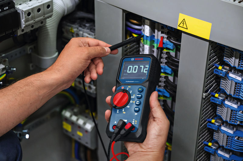 Digitales Multimeter GDM 600-15, Das GDM 600-15 Professional steigert deine Effizienz durch präzise True RMS-Messungen. Das große LCD-Display mit invertierter Anzeige sorgt für klar ablesbare Messwerte bei verschiedenen Anwendungen. Dieses vielseitige Werkzeug misst Frequenz, Durchgang, Widerstand und Kapazität und zeichnet auch Signalschwankungen mit Min/Max/Mittelwert-Messungen auf. Dank Schutzklasse IP65 und langlebigem Design mit Schutz vor Stürzen aus bis zu 2 m Höhe hält es auch rauen Bedingungen auf der Baustelle stand. Und mit einem bequemen Griff, der Ermüdungserscheinungen reduziert, kannst du dich darauf verlassen, dass das GDM 600-15 Professional die benötigte Leistung bietet sogar unter besonders anspruchsvollen Bedingungen. Das GDM 600-15 Professional ist ideal für Elektriker, HLK-Techniker, Facility Manager und Elektrotechniker und erste Wahl für Elektroinstallationen, Wartungen und Reparaturen. Es misst Spannung, Strom und Widerstand in verschiedenen elektrischen Systemen, um sie auf eine einwandfreie Funktion zu prüfen bzw. Fehler zu finden. Das kompakte Design ermöglicht die Einhandbedienung, während ein ausklappbarer Ständer und eine separate Magnetaufhängung die Anwendung erleichtern. Das mit einem Li-Ionen-Akkupack kompatible GDM 600-15 Professional bietet eine lang anhaltende Leistung. Es ist mit einer Messkategorie von CAT III 600 V auf Sicherheit geprüft und enthält zusätzlich hochwertige Messleitungen aus flexiblem, langlebigem Silikon für garantierte Zuverlässigkeit. Dieses kompakte und effiziente Multimeter unterstützt dich bei allen elektrischen Aufgaben. Tasche. 2 x 1,5 V LR6-Batterie (AA). MS 90 Professional (1 600 A03 8D2)