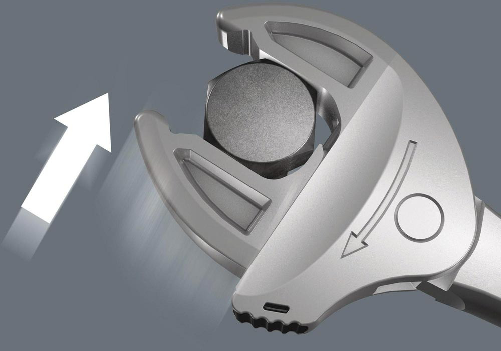 selbstjustierende Doppelmaulschlüssel für Sechskant-Schraubenköpfe bzw. -Muttern · durch die stufenlos und parallel geführten Backen werden mehrere Maulschlüssel-Einzelabmessungen ersetzt · die benötigte Größe stellt sich beim Ansetzen an der Sechskant-Mutter oder -Schraube stufenlos von selbst ein · integrierte Hebelmechanismus · Ratschenfunktion · Rückschwenkwinkel 30°