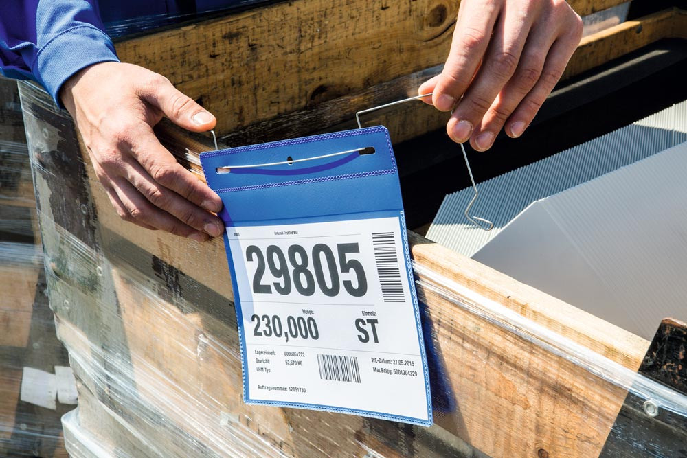 · Mit flexiblem, verzinkten Draht für eine leichte und sichere Befestigung · Für den Einsatz an Transportbehältern, Palettenkartons, Holzaufsatzrahmen und Gitterboxen · Scannertauglich und dokumentenecht · Rückenfolie und transparente Vorderfolie aus transparentem Polypropylen · Geeignet für den Außeneinsatz durch Staub- und Regenschutzklappe · Schneller Austausch der Einsteckschilder · VE 50 Stück