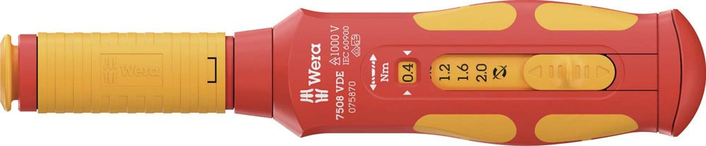 VDE-isolierter Drehmomentschraubendrehergriff mit 9 mm Sechskantaufnahme · ausschließlich für Wera Kraftform Kompakt VDE Wechselklingen · für professionelles Schrauben/Feinjustage UND für drehmomentkontrolliertes Schrauben · überrutschende, nicht überziehbare Drehmomentfunktion für Rechts-/ Linksanzug · mit fünf wählbaren Anzugsdrehmomenten Rechts/Links (Art.-Nr. 6500994: 0,4 · 0,8 · 1,2 · 1,6 · 2,0 Nm bzw. Art.-Nr. 6500995: 2,4 · 2,8 · 3,2 · 3,6 · 4,0 Nm), die extrem schnell eingestellt werden können · eine Fest-Stellung (Torque Lock) für unbegrenzte Löse-/Anzugsmomente · mit Freilaufhülse für eine gute Führung des Werkzeugs während des Schraubvorgangs