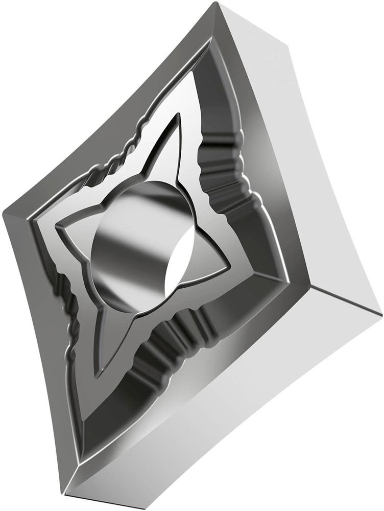 Doppelseitige negative Drehwendeschneidplatte · 80° Rhombisch mit Innenkreisdurchmesser von 12.7mm · 4.76mm Dick · 0.2mm Radius · Indexgenauigkeit nach ISO-Toleranzklasse-G · Spanbrecher SF mit verrundeter Schneidkante · im Substrat H07 · unbeschichtet WC-Co Substrat in den ISO-Bereichen K10 -K25 und S01 -S20 · zum schlichten bis medium bearbeiten von Gusseisen und Superlegierungen