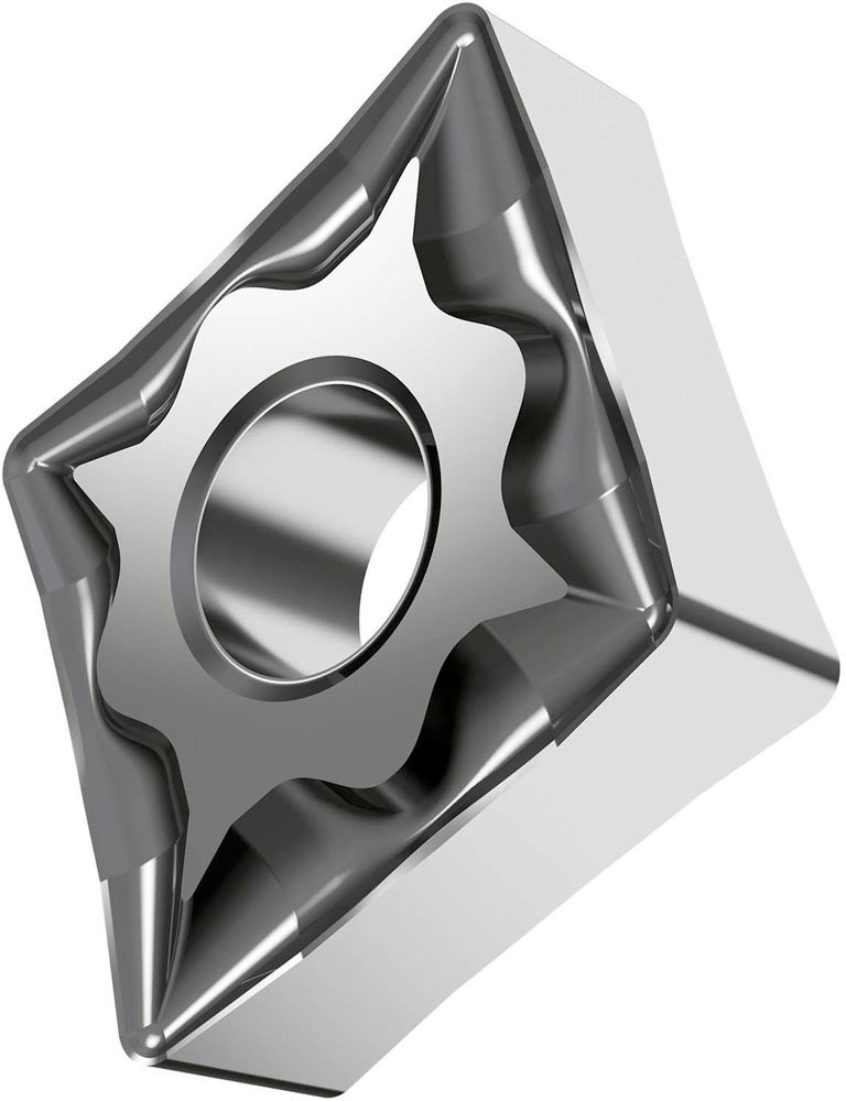 Doppelseitige negative Drehwendeschneidplatte · 80° Rhombisch mit Innenkreisdurchmesser von 12.7mm · 4.76mm Dick · 0.8mm Radius · Indexgenauigkeit nach ISO-Toleranzklasse-M · Spanbrecher NF mit verrundeter Schneidkante · im Substrat HF7 · unbeschichtet WC-Co Feinkornsubstrat · zum schlichten bis medium bearbeiten