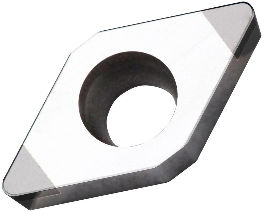 Wendeschneidplatte zum Hartdrehen mit 2 einseitig gekippten CBN-Ecken · 55° Rhomboid mit 7° Freiwinkel · Innenkreisdurchmesser 9.525mm · 3.97mm Dick · 0.4mm Schneidenradius · Wiederholgenauigkeit nach ISO-Toleranzklasse G · verrundeter und facettierter Schneidkante T-land -20°/0.1mm · im Substrat TB310 · unbeschichtetes CBN im ISO-Bereich H01-H10 · zur Hochvorschub Bearbeitung von gehärtetem Stahl