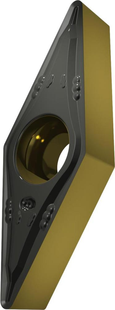 Einseitige positive Drehwendeschneidplatte · 35° Rhombisch mit 5° Freiwinkel · Innenkreisdurchmesser von 9.525mm · 4.76mm Dick · 0.8mm Radius · Indexgenauigkeit nach ISO-Toleranzklasse-M · Spanbrecher FM mit verrundeter Schneidkante · im Substrat T9415 · MT-CVD beschichtet WC-Co Substrat im ISO-Bereich P05 -P30 · zum schlichten bis medium bearbeiten von Stählen
