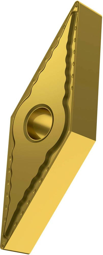 Doppelseitige negative Drehwendeschneidplatte · 35° Rhombisch mit Innenkreisdurchmesser von 9.525mm · 4.76mm Dick · 0.4mm Radius · Indexgenauigkeit nach ISO-Toleranzklasse-M · Spanbrecher SF mit verrundeter Schneidkante · im Substrat T6310 · PVD beschichtet WC-Co Feinstkornsubstrat in den ISO-Bereichen P01 -P15/M01 -M15/K05 -K20/S01 -S15 und H01 -H15 · zum schlichten bis medium bearbeiten von Stählen · nichtrostenden Stählen · Gusseisen · Superlegierungen und gehärtetem Material
