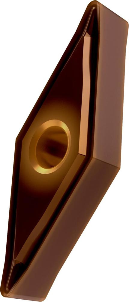 Doppelseitige negative Drehwendeschneidplatte · 35° Rhombisch mit Innenkreisdurchmesser von 9.525mm · 4.76mm Dick · 0.8mm Radius · Indexgenauigkeit nach ISO-Toleranzklasse-M · Spanbrecher NF mit verrundeter Schneidkante · im Substrat T8430 · PVD beschichtet WC-Co Feinkornsubstrat in den ISO-Bereichen P20 -P40 und M20 -M35 · zum schlichten bis medium bearbeiten von Stählen und nichtrostenden Stählen