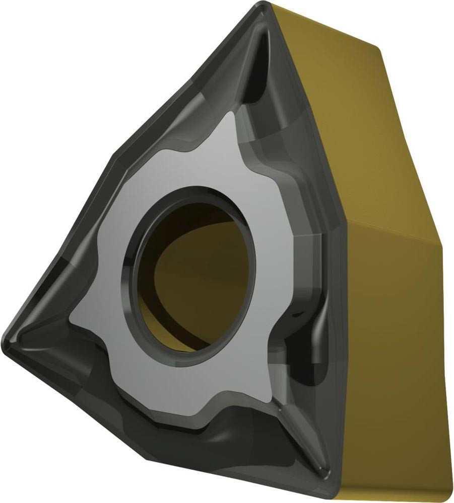 Doppelseitige negative Drehwendeschneidplatte · 80° Trigon mit Innenkreisdurchmesser von 9.525mm · 4.76mm Dick · 0.4mm Radius · Indexgenauigkeit nach ISO-Toleranzklasse-M · Spanbrecher NF mit verrundeter Schneidkante · im Substrat T9415 · MT-CVD beschichtet WC-Co Substrat im ISO-Bereich P05 -P30 · zum schlichten bis medium bearbeiten von Stählen