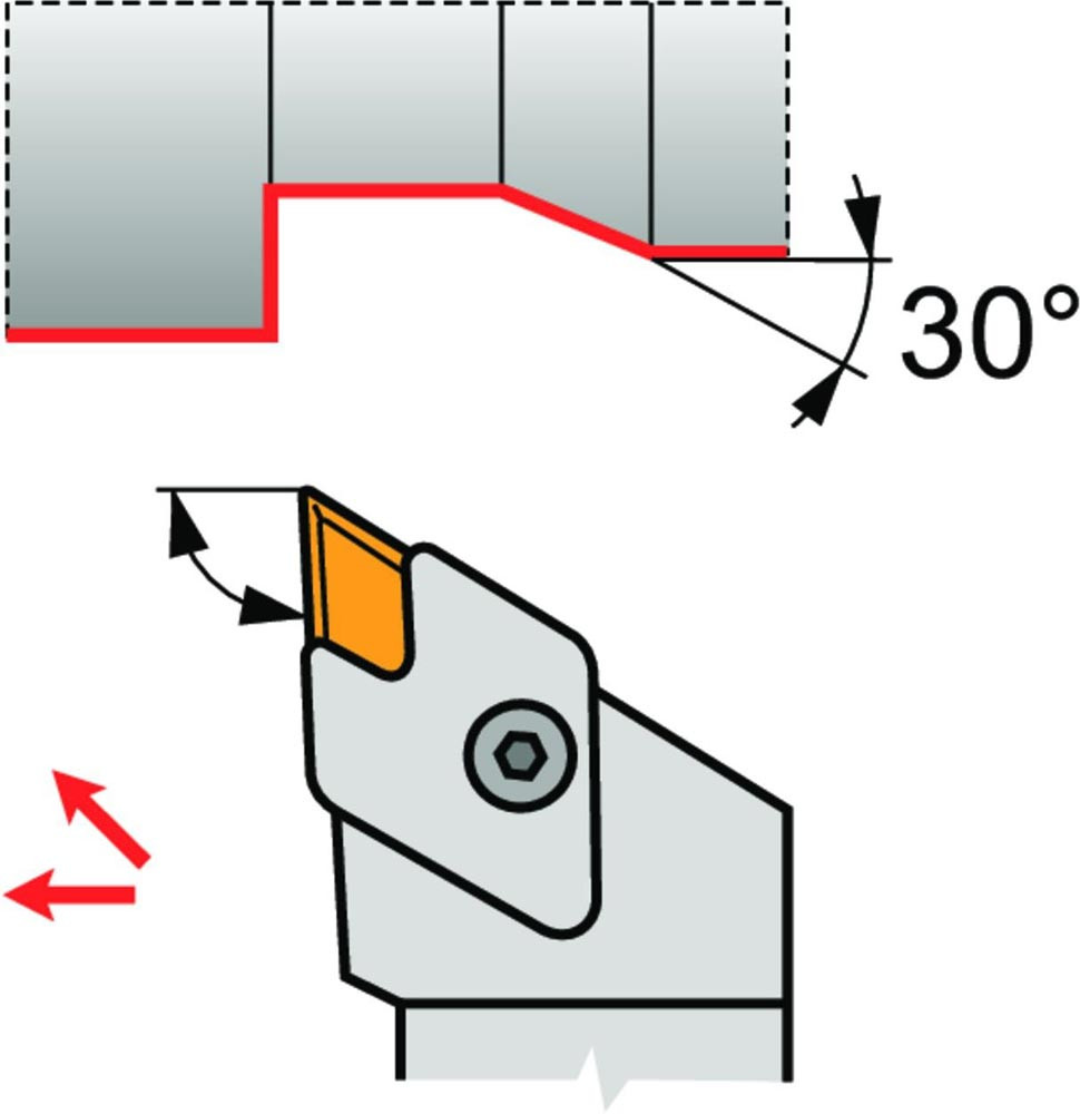 Dreh-Trägerwerkzeug von oben geklemmt zum spannen von 55° Parallelogramm negative Wendeschneidplatten mit einem Innenkreisdurchmesser von 9.525mm · 4.76mm Dick (ISO Bezeichnung KN.X 1604…L ) · linke Ausführung zum 93° Stirndrehen mit abgesetzem Schaft · 32mm Werkzeughöhe x 25mm Breite x 170mm Länge für entgraten · Kegeldrehen · Kopierdrehen in einer und mehreren Richtungen und Längsdrehen mit und ohne Schulter