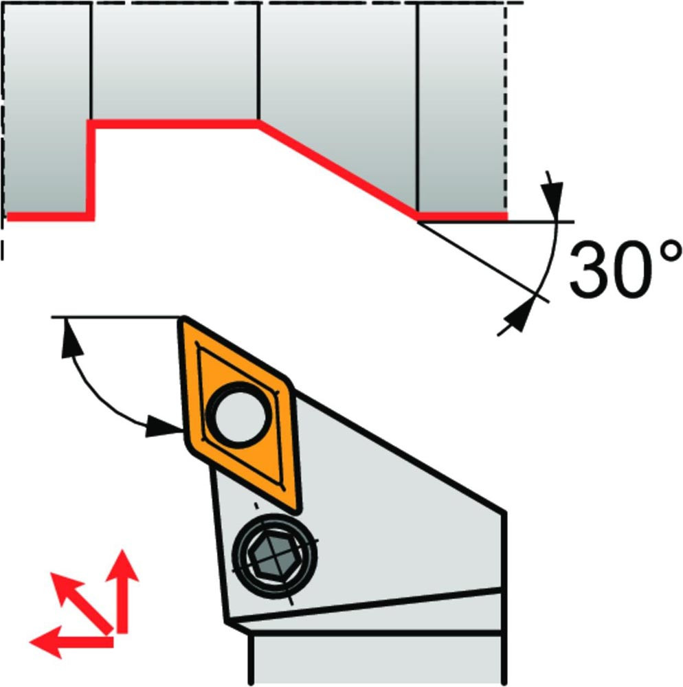 Dreh-Trägerwerkzeug mit Kniehebelklemmung zum spannen von 55° Rhombus negative Wendeschneidplatten mit einem Innenkreisdurchmesser von 12.7mm · 6.35mm Dick (ISO Bezeichnung DN.. 1506.. ) · rechte Ausführung zum 93° Stirndrehen mit abgesetzem Schaft · 32mm Werkzeughöhe x 32mm Breite x 170mm Länge für Kegeldrehen · Kopierdrehen in einer und mehreren Richtungen und Längsdrehen mit und ohne Schulter
