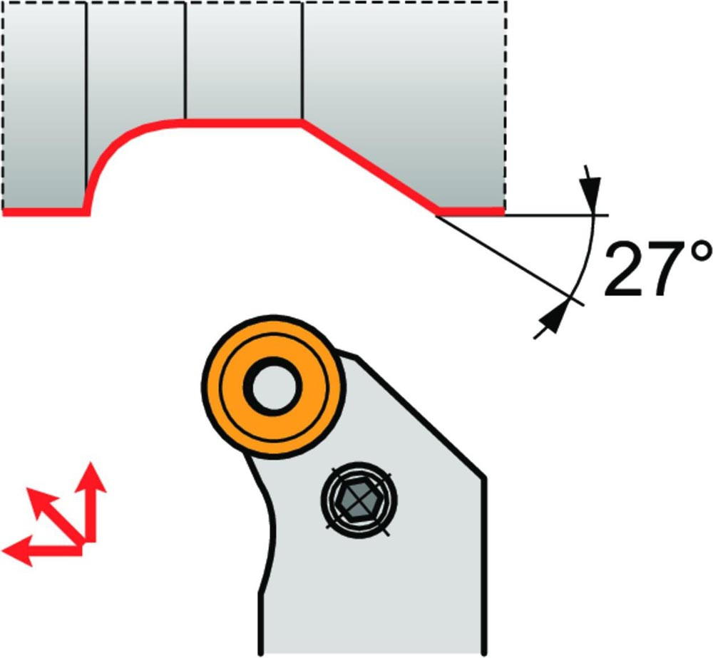 Dreh-Trägerwerkzeug mit Kniehebelklemmung zum spannen von Rund positive Wendeschneidplatten mit einem Durchmesser von 25mm · 7.94mm Dick (ISO Bezeichnung RCMX 2507MO ) · linke Ausführung zum Stirndrehen mit abgesetzem Schaft · 40mm Werkzeughöhe x 40mm Breite x 250mm Länge für Kegeldrehen · Kopierdrehen in einer und mehreren Richtungen · Stirndrehen ohne Schulter und Längsdrehen ohne Schulter