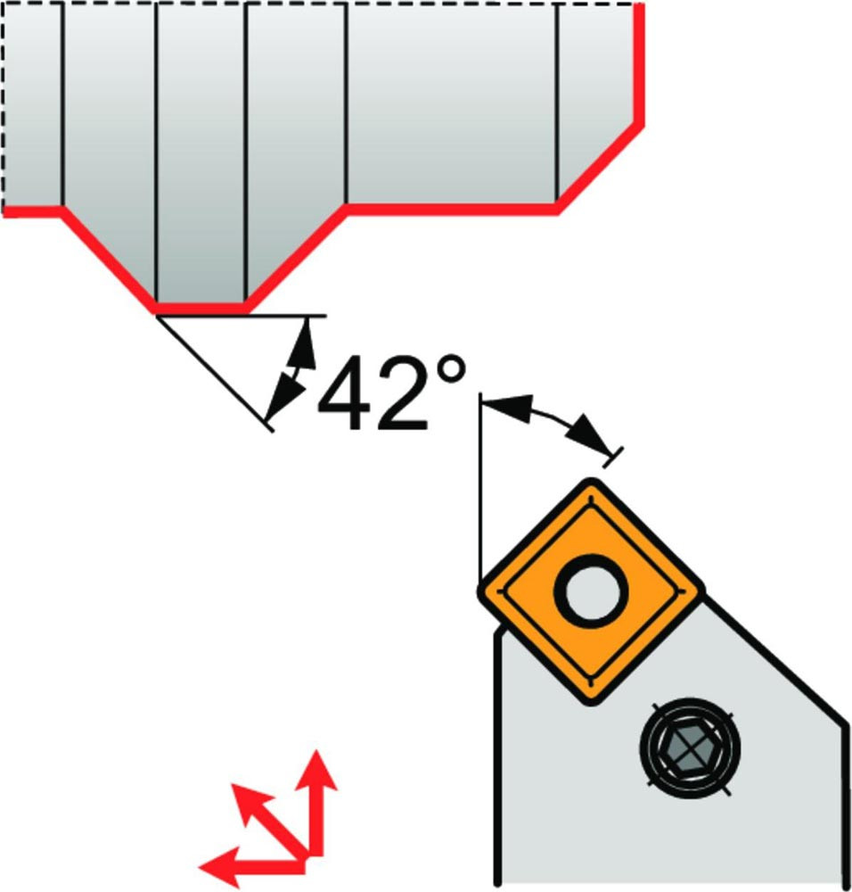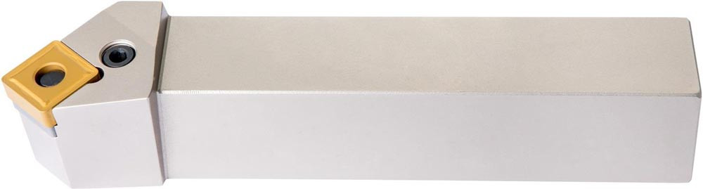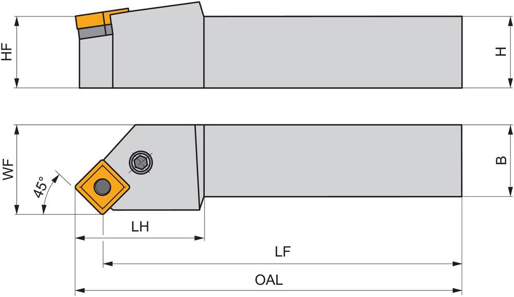 Dreh-Trägerwerkzeug mit Kniehebelklemmung zum spannen von Viereckig negative Wendeschneidplatten mit einem Innenkreisdurchmesser von 12.7mm · 4.76mm Dick (ISO Bezeichnung SN.. 1204.. ) · rechte Ausführung zum 45° Stirndrehen mit abgesetzem Schaft · 20mm Werkzeughöhe x 20mm Breite x 125mm Länge für entgraten · Kegeldrehen · Kopierdrehen in einer und mehreren Richtungen · Stirndrehen ohne Schulter und Längsdrehen ohne Schulter