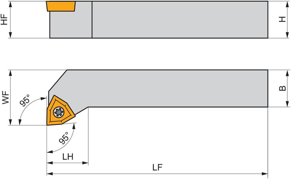 Dreh-Trägerwerkzeug mit Schraubklemmung zum spannen von 80° Trigonal positive Wendeschneidplatten mit einem Innenkreisdurchmesser von 9.525mm · 3.97mm Dick (ISO Bezeichnung WC.. 06T3.. ) · linke Ausführung zum 95° Stirn-und Längsdrehen mit abgesetzem Schaft · 20mm Werkzeughöhe x 20mm Breite x 125mm Länge für Kegeldrehen · Stirndrehen mit und ohne Schulter und Längsdrehen mit und ohne Schulter