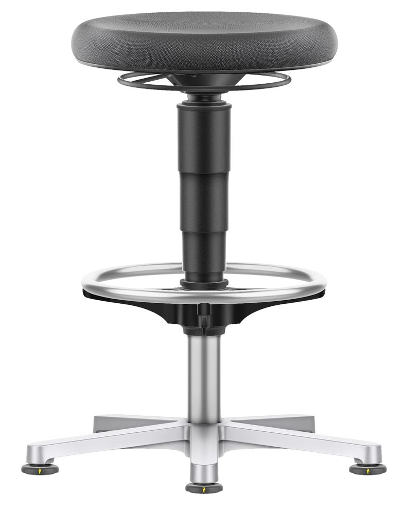 · Sehr großer Sitzhöhenverstellbereich · Höhenverstellung durch Ringauslösung · Fugenarm, leicht zu reinigen, desinfizierbar · Fußkreuz aus Aluminium Ø 540 mm · Platzsparend und leicht mobil · Für Industrie, Dienstleistungen und Labor · Schwarzer Farbring zum Schutz der Polster · ESD-konform nach EN 61340-5-1