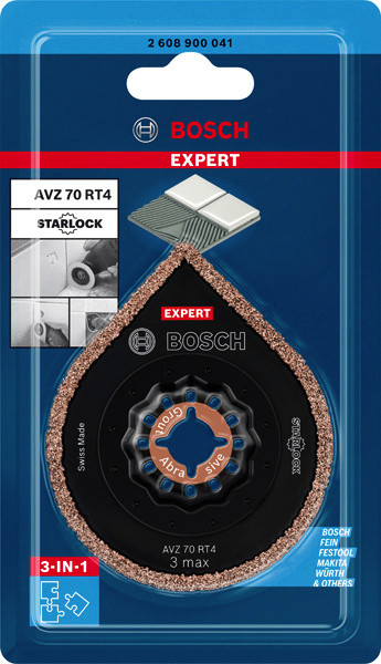 Mehrzwecknutzung in Fliesen! Erreicht mit der Spitze jede Ecke Das Entfernen einer beschädigten Fliese, ohne die gesamte Wand neu gestalten zu müssen, ist einer der großen Vorteile der Starlock-Multifunktionswerkzeugs und mit dem EXPERT AVZ 70 RT4 3 max ist es noch einfacher. Mit diesem einen genialen Blatt kannst du alten Fugenmörtel enfernen und dabei selbst schwer zugängliche Ecken erreichen. Nach dem Enfernen der Fliese kann der Fliesenkleber bis in die Ecken abgeschliffen werden. Dies ist das Blatt für oszillierende Multifunktionswerkzeuge, das für Fliesenarbeiten benötigt wird: ein einfaches Design, das deine Arbeit erleichtert und maximale Effizienz gewährleistet. Mit der Bosch EXPERT AVZ 70 RT4 3 max hast du immer das richtige Starlock-Zubehör zur Hand. Spare Zeit und Geld mit einem Multifunktionszubehör