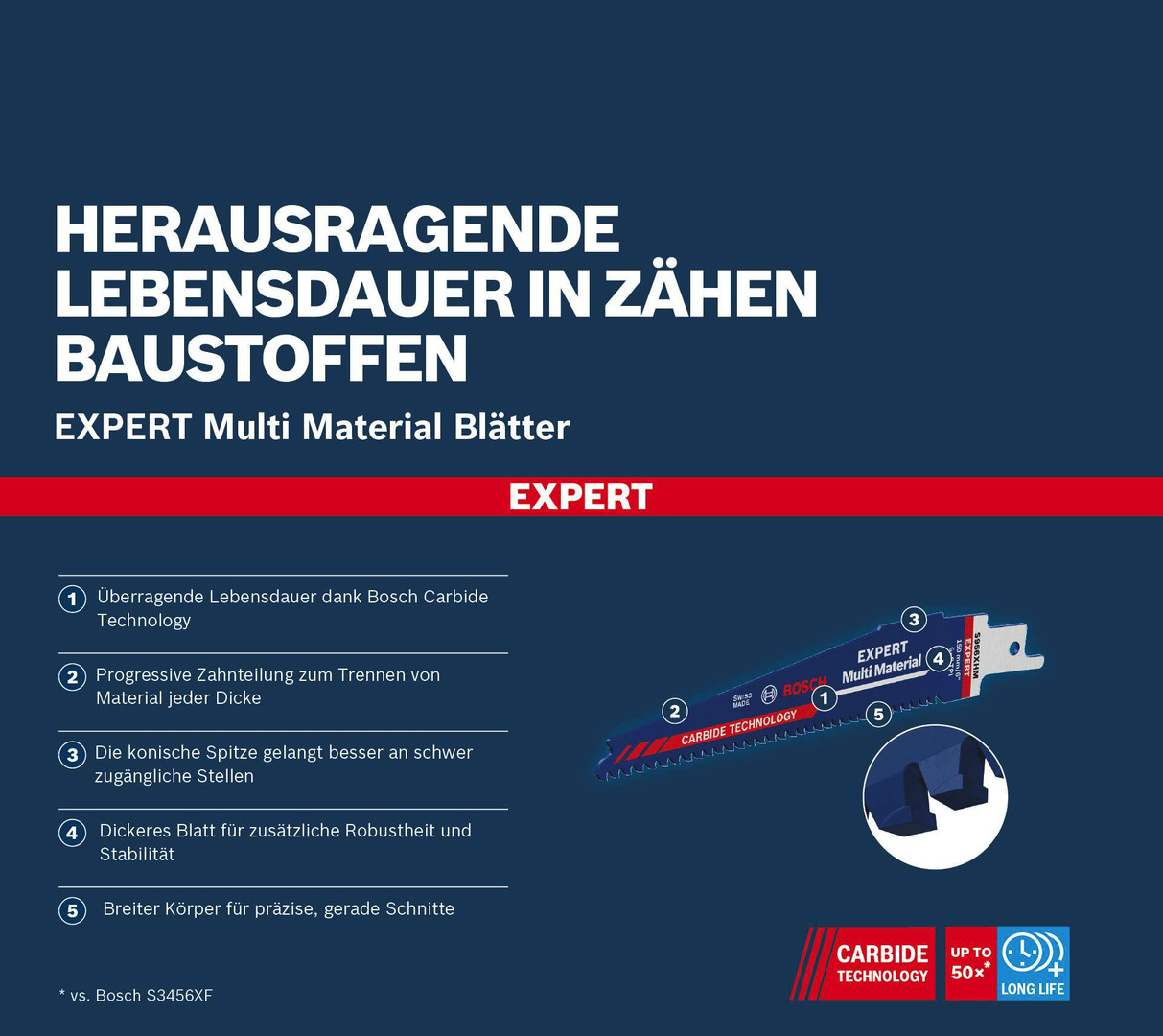 Herausragende Lebensdauer in zähen Baustoffen! Progressive Zahnteilung zum Trennen von Material jeder Dicke Viele Blätter, die angeblich für mehrere Materialien geeignet sind, funktionieren gut in Holz und Baustahl. Härtere Elemente wie Schrauben oder Metallbeschläge können sie allerdings nicht schneiden. Das EXPERT Multi Material hat da keine Probleme: Seine Carbide-Zähne können härteste Stahlsorten schneiden immer und immer wieder. Da das Bosch EXPERT Multi Material-Säbelsägeblatt so viel länger hält und in jedem Material gute Leistung bietet, ist es für Profis von großem Wert. Sie erreichen mehr Produktivität bei ihrer Arbeit und müssen weniger Blätter kaufen. Überragende Lebensdauer dank Bosch Carbide Technology