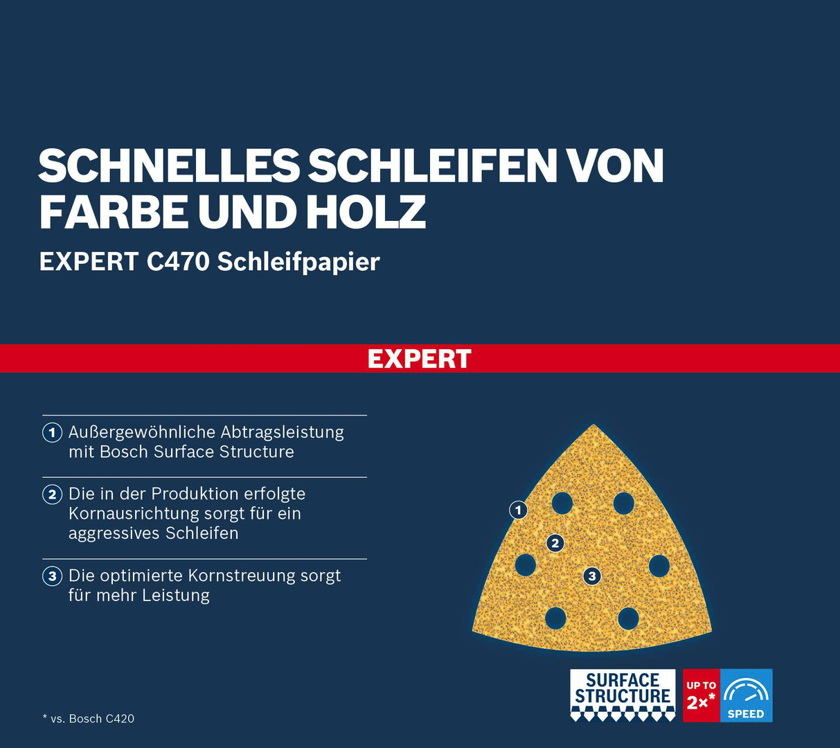 Schnelles Schleifen von Farbe und Holz! Die in der Produktion erfolgte Kornausrichtung sorgt für ein aggressives Schleifen Das Schleifen großer Flächen ist zeitaufwändig: Viele Schleifpapiere setzen sich schnell mit Staub zu und verlieren ihre Abrasivität, wodurch der eigentliche Schleifprozess mehr Zeit benötigt. Durch die Kombination von scharfen Körnern und spezieller Technologie, welche das Zusetzen verhindert, behält das EXPERT C470 Schleifpapier seine besonderen Fähigkeiten bei. Dies bedeutet, dass du schneller und länger arbeiten kannst, ohne Kompromisse beim Schleifergebnis eingehen zu müssen. Verbringe weniger Zeit mit dem Schleifen oder erledige mehr Arbeiten in der gleichen Zeit mit dem Bosch EXPERT C470 Schleifpapier. Außergewöhnliche Abtragsleistung mit Bosch Surface Structure