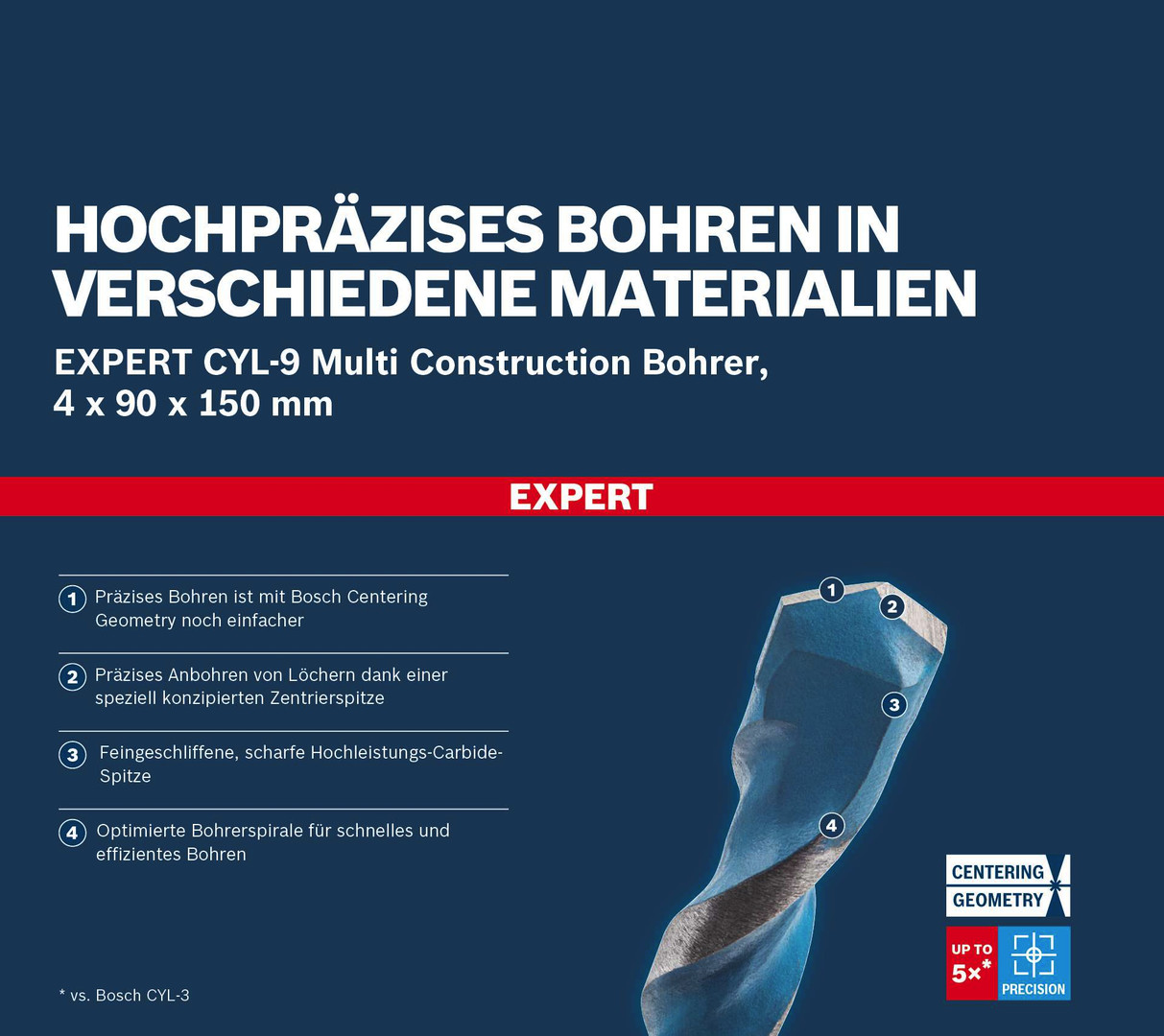 Hochpräzises Bohren in verschiedene Materialien! Präzises Anbohren von Löchern dank einer speziell konzipierten Zentrierspitze Moderne Baustellen erfordern das Arbeiten mit vielen verschiedenen Materialien und man weiß nie, was man als Nächstes bohren muss. Es kann schwierig und zeitaufwendig sein, den richtigen Bohrer zu finden es sei denn, du hast den EXPERT Multi Construction-Bohrer. Der Bosch EXPERT CYL-9 Multi Construction-Rundschaftbohrer darf in keinem Werkzeugkasten fehlen: Man kann jede Arbeit präzise erledigen und verliert keine Zeit mit der Suche nach dem richtigen Bohrer. Präzises Bohren ist mit Bosch Centering Geometry noch einfacher