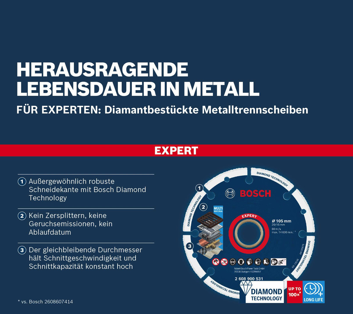 Herausragende Lebensdauer in Metall! Kein Zersplittern bei Fall, keine Ausdünstungen und lange Haltbarkeit Das Schneiden von Metallen wie Stahl und Gusseisen war für Winkelschleifscheiben bisher immer schwierig. Viele Arbeiter kennen den chemischen Geruch von gebundenen Scheiben, die beim Schneiden buchstäblich wegbrennen. Mit dem EXPERT Diamond Metal Wheel gehört dieser Geruch der Vergangenheit an genau wie regelmäßige Besuche in einem Geschäft, um neue Metallscheiben zu kaufen. Für Handwerker und Bauarbeiter, die kein Geld mehr für gebundene Scheiben ausgeben möchten, bietet die Bosch EXPERT Diamond Metal Wheel Diamanttrennscheibe eine völlig neue Art des Metallschneidens. Außergewöhnlich robuste Schneidekante mit Bosch Diamond Technology