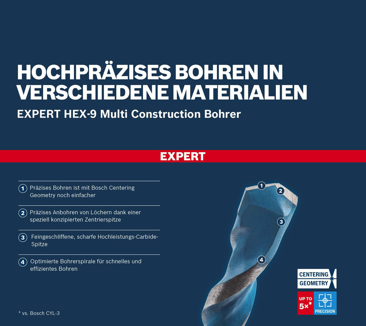 Hochpräzises Bohren in verschiedene Materialien! Präzises Anbohren von Löchern dank einer speziell konzipierten Zentrierspitze Moderne Baustellen erfordern das Arbeiten mit vielen verschiedenen Materialien und man weiß nie, was man als Nächstes bohren muss. Es kann schwierig und zeitaufwendig sein, den richtigen Bohrer zu finden es sei denn, du hast den EXPERT Multi Construction-Bohrer. Der Bosch Expert HEX-9 Multi Construction Bohrer darf in keinem Werkzeugkasten fehlen: Man kann jede Arbeit präzise erledigen und verliert keine Zeit mit der Suche nach dem richtigen Bohrer. Präzises Bohren ist mit Bosch Centering Geometry noch einfacher