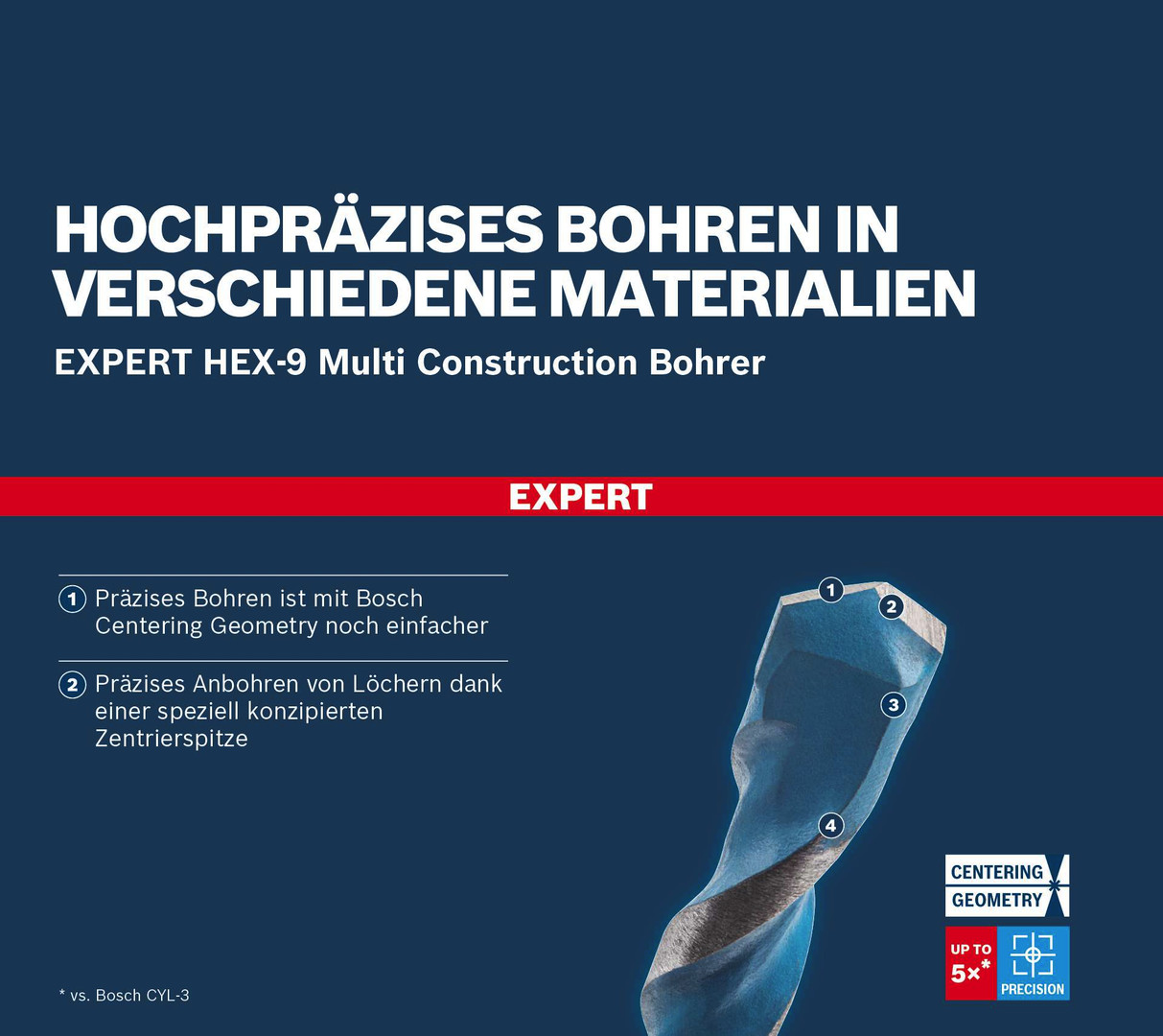 Hochpräzises Bohren in verschiedene Materialien! Präzises Anbohren von Löchern dank einer speziell konzipierten Zentrierspitze Moderne Baustellen erfordern das Arbeiten mit vielen verschiedenen Materialien und man weiß nie, was man als Nächstes bohren muss. Es kann schwierig und zeitaufwendig sein, den richtigen Bohrer zu finden es sei denn, du hast die EXPERT Multi Construction-Bohrer. Die Bosch EXPERT HEX-9 Multi Construction-Bohrer sind die einzigen Bohrer, die du immer griffbereit haben solltest: Man kann jede Arbeit präzise erledigen und verliert keine Zeit mit der Suche nach dem benötigten Bohrer. Dieses Set wird in einem Kunststoffhalter geliefert, den du in einen Pick and Click-Koffer einrasten kannst. Damit sind die Bohrer in deinem individuell gestalteten Werkzeugkasten sicher aufbewahrt. Präzises Bohren ist mit Bosch Centering Geometry noch einfacher