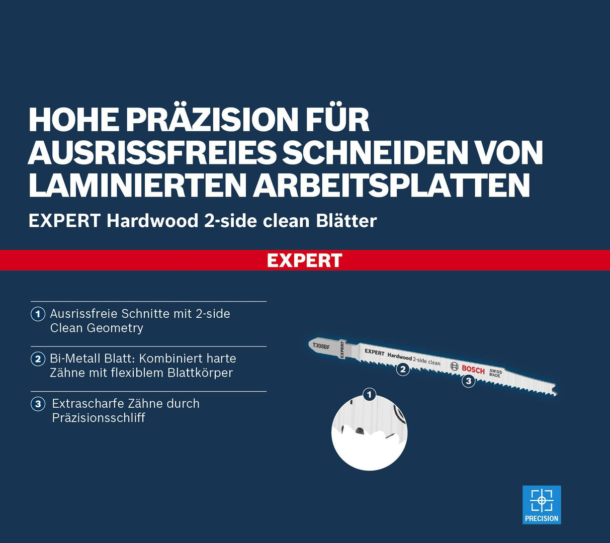 Hohe Präzision für ausrissfreies Schneiden von laminierten Arbeitsplatten! Bi-Metall Blatt: Kombiniert harte Zähne mit flexiblem Blattkörper Unter Tischlern und Schreinern war es schon immer eine Kunst sicherzustellen, dass der sichtbare Teil des Arbeitsmaterials die saubere Seite eines Stichsägenschnitts zeigt. Manchmal muss man das Werkstück zum Sägen umdrehen. Oder die Stichsäge sägt von der Rückseite, um die gewünschte Schnittqualität auf der Sichtseite zu haben. Oder du verwendest das EXPERT Hardwood 2-side clean, welches dank seiner Zahngeometrie auf beiden Seiten einen perfekten, ausrissfreien Schnitt bietet. Hergestellt aus Bi-Metall einer Leiste aus Schnellarbeitsstahl, die auf ein flexibles Stahlblatt geschweisst wird, um Festigkeit und Flexibilität zu kombinieren ist das Bosch EXPERT Hardwood 2-side clean-Stichsägeblatt robust genug, um beschichtete Küchenplatten aus Grobspanplatten oder Hartholz zu schneiden. Erhältlich für ausrissfreie, gerade Schnitte (T308BF) und für besonders genaue ausrissfreie Winkelschnitte (T308BFP). Ausrissfreie Schnitte mit 2-side Clean Geometry