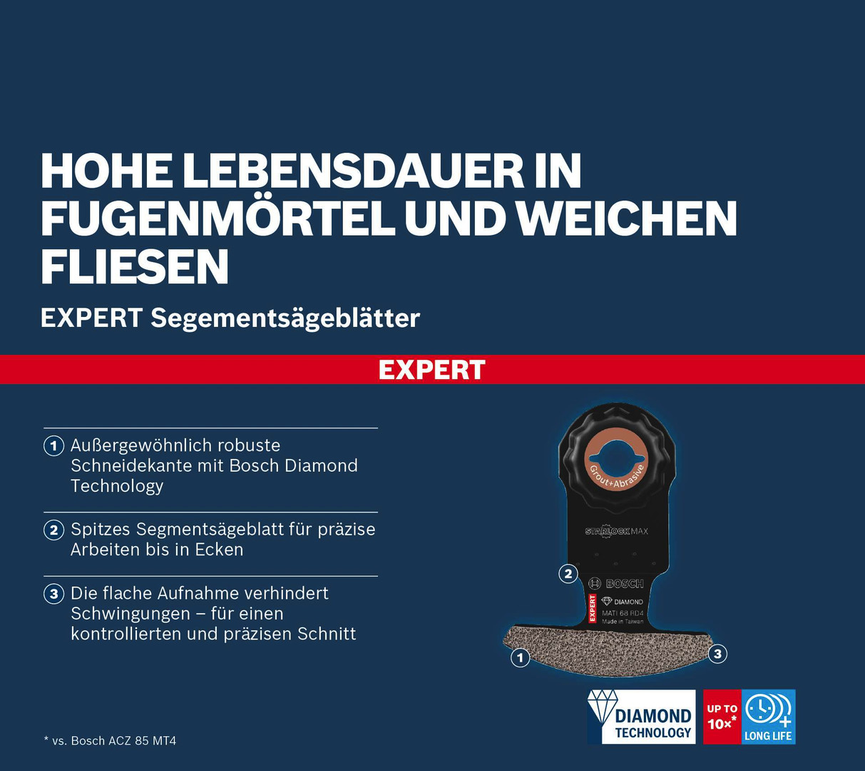 Hohe Lebensdauer in Fugenmörtel und weichen Fliesen! Spitzes Segmentsägeblatt für präzise Arbeiten bis in Ecken Das Entfernen der Fugenmasse zwischen den Fliesen ist eine Aufgabe, die Bad- und Kücheninstallateure regelmäßig durchführen müssen. Multifunktionswerkzeuge sind dafür ideal geeignet, aber manchmal ist es schwierig, in die Ecken oder um Armaturen herum zu gelangen. Mit dem EXPERT Corner Blade Blatt ist dies kein Problem. Es bietet nicht nur eine lange Lebensdauer und schnelle Entfernung des Mörtels, sondern erreicht auch problemlos Ecken. Das Bosch EXPERT Corner Blade für Multifunktionswerkzeuge ist das perfekte Zubehör für Fliesenleger und Bad- oder Kücheninstallateure. Aufgrund seiner extrem langen Lebensdauer und Vielseitigkeit sollte es in deinem Werkzeugkasten ganz oben liegen. Außergewöhnlich robuste Schneidekante mit Bosch Diamond Technology