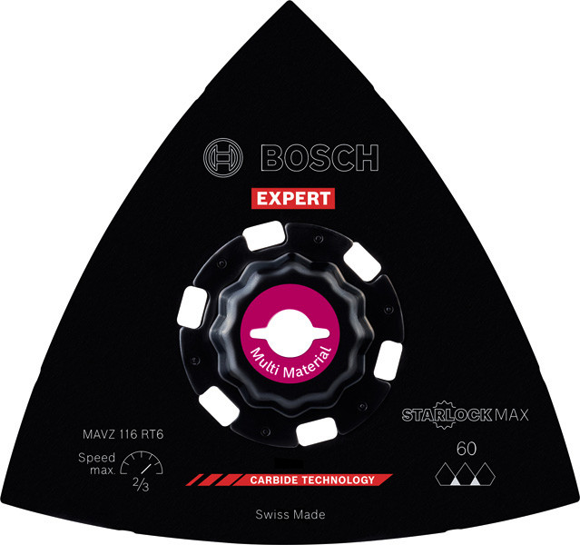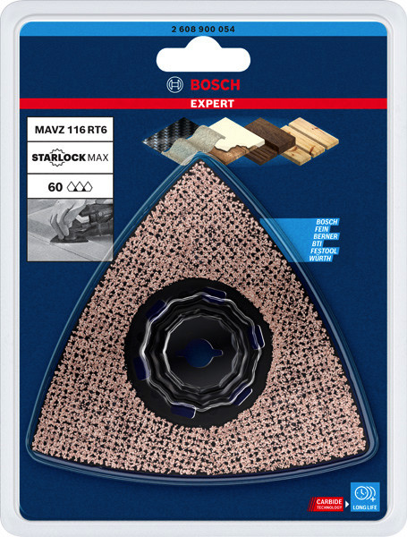Hohe Lebensdauer beim Schleifen von verschiedensten Materialien! Die Delta-Form ermöglicht das Schleifen von Ecken und Kanten Kleine, aber harte Schleifarbeiten zum Entfernen von altem Material und zum Vorbereiten von Oberflächen sind mit herkömmlichen Schleifmaschinen oder von Hand fast unmöglich zu erledigen. Selbst wenn du die Oberfläche erreichen kannst, reißt das Schleifpapier ein. Mit der EXPERT Sanding Plate kannst du jedoch mit deinem oszillierenden Multifunktionswerkzeug Ecken erreichen und schwierige Materialien schleifen. Die groben, offenen Körner des RT2 (Körnung 20) eignen sich am besten zum Entfernen von Mörtel hinter Fliesen, von Teppichkleber oder für die Grobbearbeitung von Holz. Der RT4 (Körnung 40) eignet sich am besten zum Entfernen von dickem Lack, er kann aber auch mit Mörtel und Kleber umgehen. Der RT6 (Körnung 60) ist der Lackspezialist, während der RT10 (Körnung 100) ideal zum Schleifen und Vorbereiten sauberer Holzoberflächen geeignet ist. Überragende Lebensdauer dank Bosch Carbide Technology
