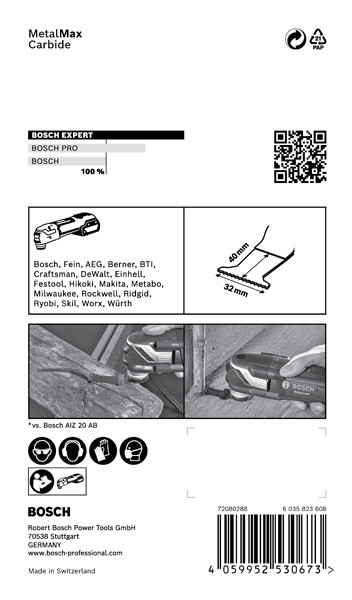 Herausragende Lebensdauer in harten und zähen Metallen! Zusätzliche Beschichtung macht Carbide härter Wenn gehärtete Schrauben rosten oder auf andere Weise stecken bleiben, besteht die einzige Option darin, sie flach an der Oberfläche abzuschneiden. Der EXPERT MetalMax macht auch in gehärtetem Metall einen perfekten bündigen Schnitt. Mit seiner herausragenden Langlebigkeit ist es das perfekte Zubehör für Handwerker, die harte Materialien mit einem Multifunktionswerkzeug schneiden möchten. Du hast gesehen, wie mühelos das Multifunktionswerkzeug in und durch Holz sägen kann: Mit dem Bosch EXPERT MetalMax Blatt für Multifunktionswerkzeuge kann Metall genauso zersägt werden. Es sägt sogar mühelos gehärtete Fensterschrauben und Armierungen. Überragende Lebensdauer dank Bosch Carbide Technology