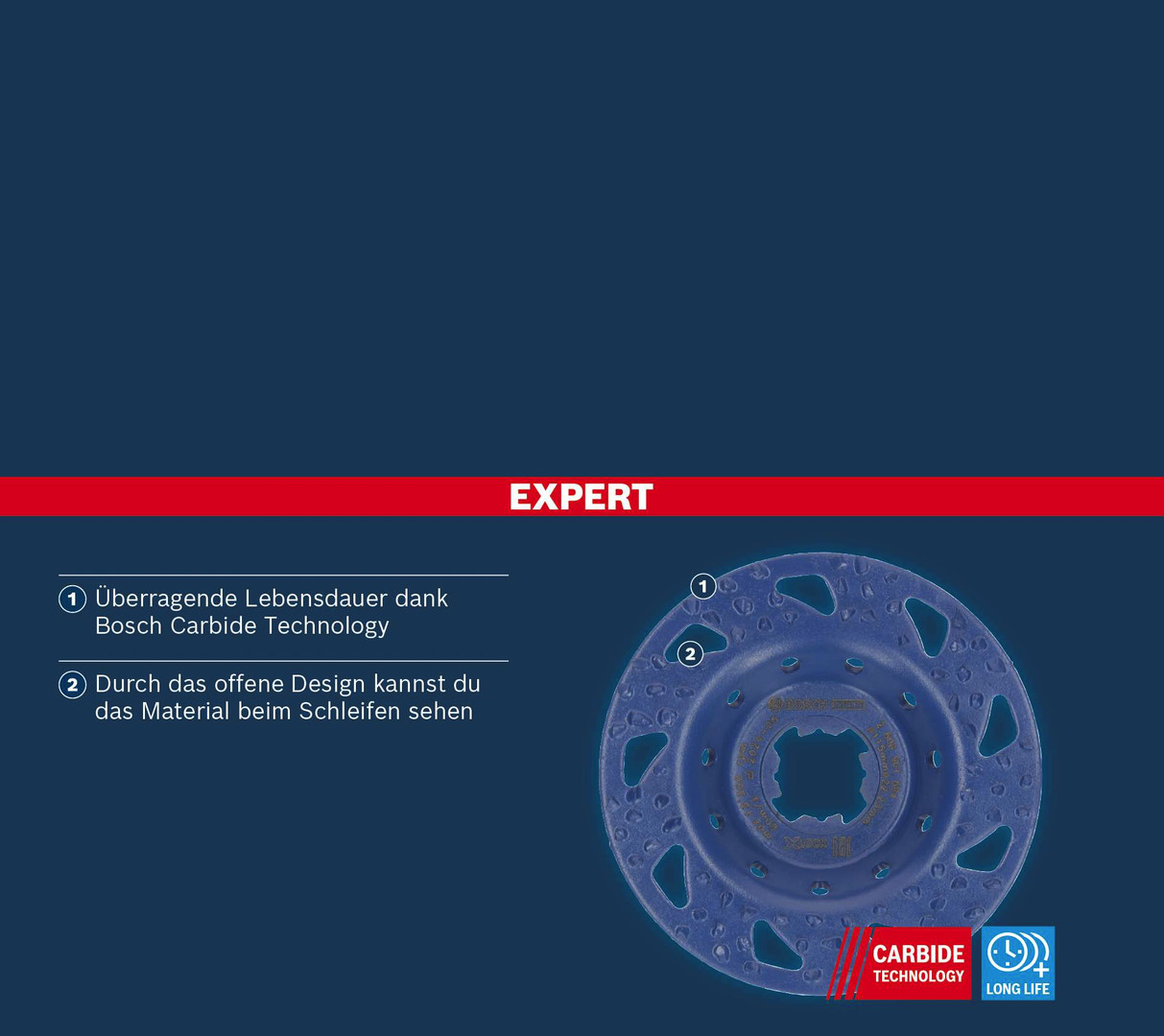Überragende Lebensdauer beim Schleifen verschiedenster Materialien! Durch das offene Design kannst du das Material beim Schleifen sehen Bei der Verwendung eines Winkelschleifers mit Topfscheiben musst du kurz anhalten, um zu sehen, wieviel du schon geschafft hast. Die robuste EXPERT Multi Material Carbide-Topfscheibe ermöglicht durch ihre offene Konstruktion auch beim Schleifen den direkten Blick auf den Untergrund. Damit kannst du deine Renovierungs- und Ausbauarbeiten effizienter und mit weniger Unterbrechungen durchführen. Dank der Carbide Technology von Bosch ist die EXPERT Multi Material Carbide-Topfscheibe außergewöhnlich langlebig und leistungsfähig, sodass sie für ein breites Anwendungsspektrum eingesetzt werden kann. Sie kann zum Glätten von Beton und zum Schleifen von Kalkstein und Marmor sowie Weichholz, Hartholz und Kunststoff verwendet werden. Mit der Topfscheibe lässt sich auch alter Teppichkleber entfernen oder die erste Reinigung von mit Bitumen bedeckten Oberflächen durchführen. Die abgeschrägte Version eignet sich hervorragend für größere Holzschnitzprojekte. Überragende Lebensdauer dank Bosch Carbide Technology