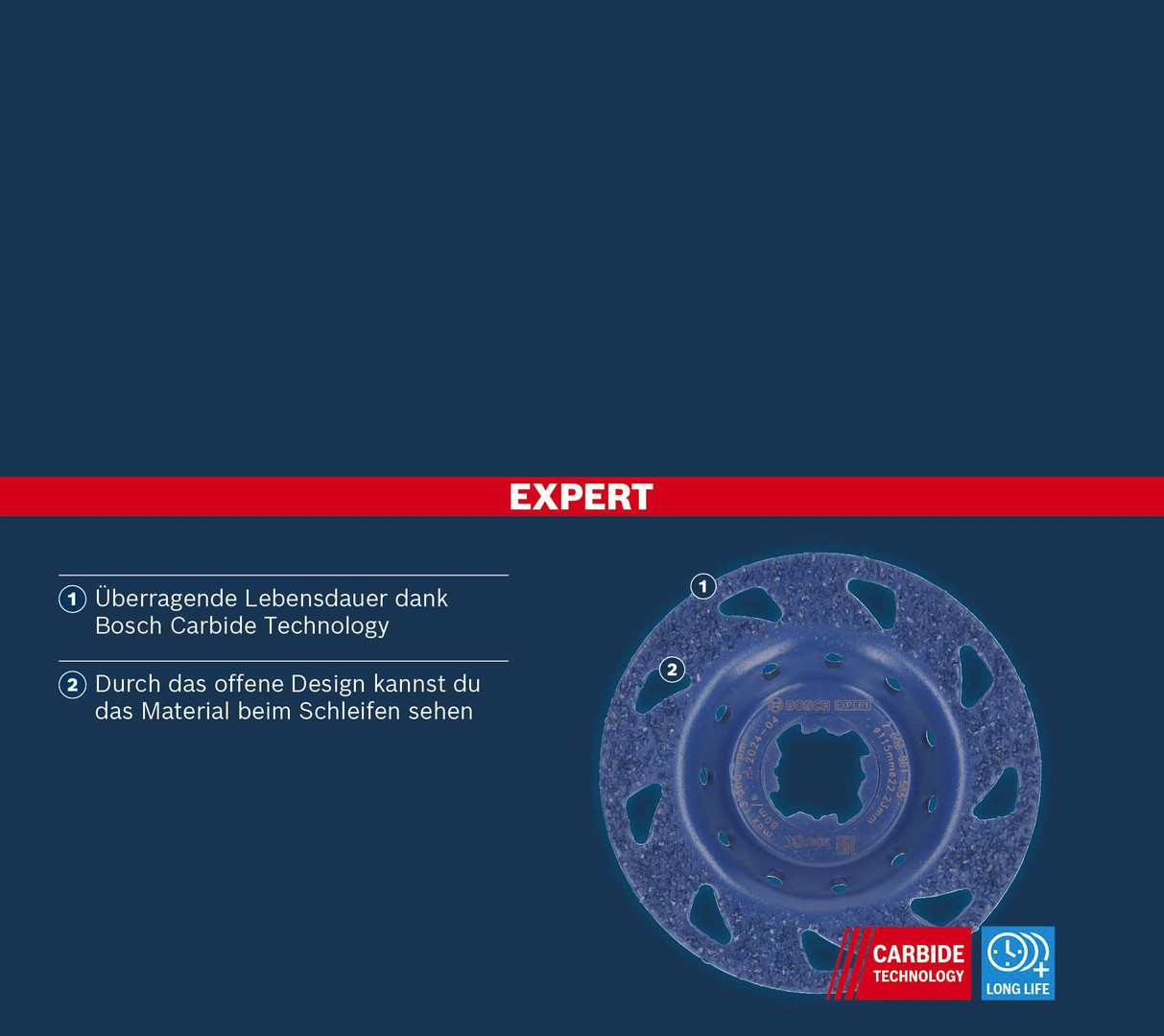 Überragende Lebensdauer beim Schleifen verschiedenster Materialien! Durch das offene Design kannst du das Material beim Schleifen sehen Bei der Verwendung eines Winkelschleifers mit Topfscheibe musst du kurz anhalten, um zu sehen, wieviel du schon geschafft hast. Die robuste EXPERT Multi Material Carbide-Topfscheibe ermöglicht durch ihre offene Konstruktion auch beim Schleifen den direkten Blick auf den Untergrund. Damit kannst du deine Renovierungs- und Ausbauarbeiten effizienter und mit weniger Unterbrechungen durchführen. Dank der Carbide Technology von Bosch ist die EXPERT Multi Material Carbide-Topfscheibe außergewöhnlich langlebig und leistungsfähig, sodass sie für ein breites Anwendungsspektrum eingesetzt werden kann. Sie eignet sich sehr gut dafür, alte Farbe von Holzfensterrahmen und Terrassendielen zu entfernen und Hufe von Huftieren zu beschneiden. Die abgeschrägte Version eignet sich hervorragend für größere Holzschnitzprojekte. Überragende Lebensdauer dank Bosch Carbide Technology