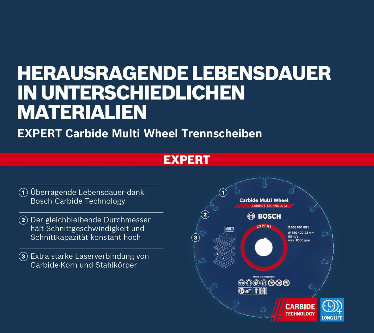 Herausragende Lebensdauer in verschiedenen Werkstoffen! Der gleichbleibende Durchmesser hält Schnittgeschwindigkeit und Schnittkapazität konstant hoch Profis schätzen Winkelschleifer für ihre Fähigkeit, zähe Materialien wie Beton, Stein und Metall zu trennen. Mit der EXPERT Multi Material-Trennscheibe kann dieses wunderbare Werkzeug noch vielseitiger eingesetzt werden. Du schneidest effizient alle Arten von weicheren Materialien wie Holz, Kunststoff und moderne Verbundwerkstoffe. Mit der EXPERT Multi Material wird dein Winkelschleifer noch vielseitiger. Viele Handwerker benötigen möglicherweise nur dieses einzige Elektrowerkzeug. Überragende Lebensdauer dank Bosch Carbide Technology