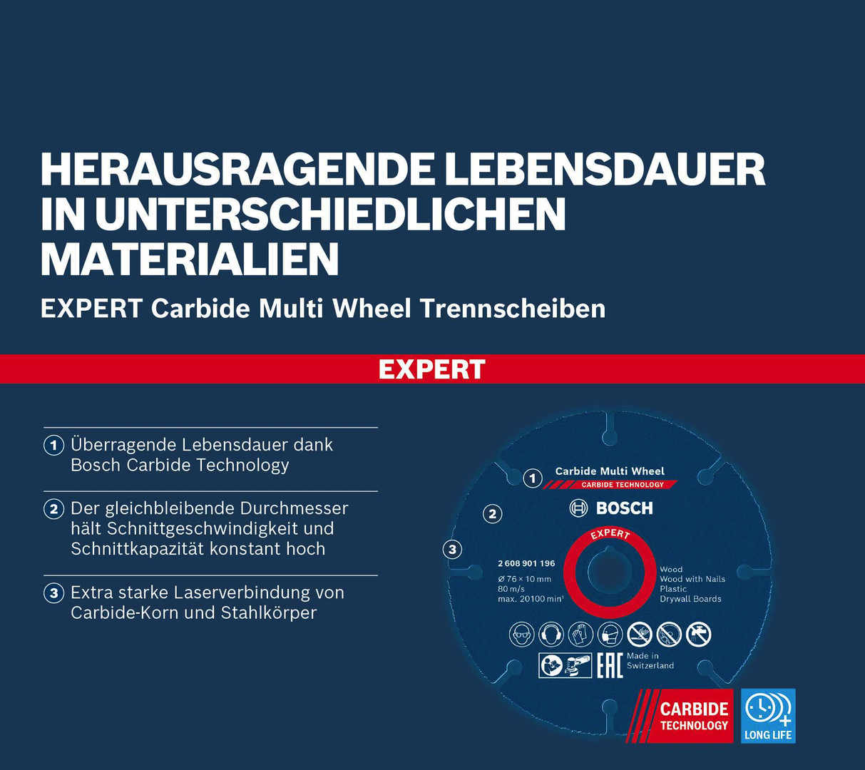 Herausragende Lebensdauer in verschiedenen Werkstoffen! Der gleichbleibende Durchmesser hält Schnittgeschwindigkeit und Schnittkapazität konstant hoch Profis schätzen Winkelschleifer für ihre Fähigkeit, zähe Materialien wie Beton, Stein und Metall zu trennen. Mit der EXPERT Multi Material Trennscheibe kann dieses wunderbare Werkzeug noch vielseitiger eingesetzt werden. Du schneidest effizient alle Arten von weicheren Materialien wie Holz, Kunststoff und moderne Verbundwerkstoffe. Mit der EXPERT Multi Material wird dein Winkelschleifer noch vielseitiger. Viele Handwerker benötigen möglicherweise nur dieses einzige Elektrowerkzeug. Überragende Lebensdauer dank Bosch Carbide Technology