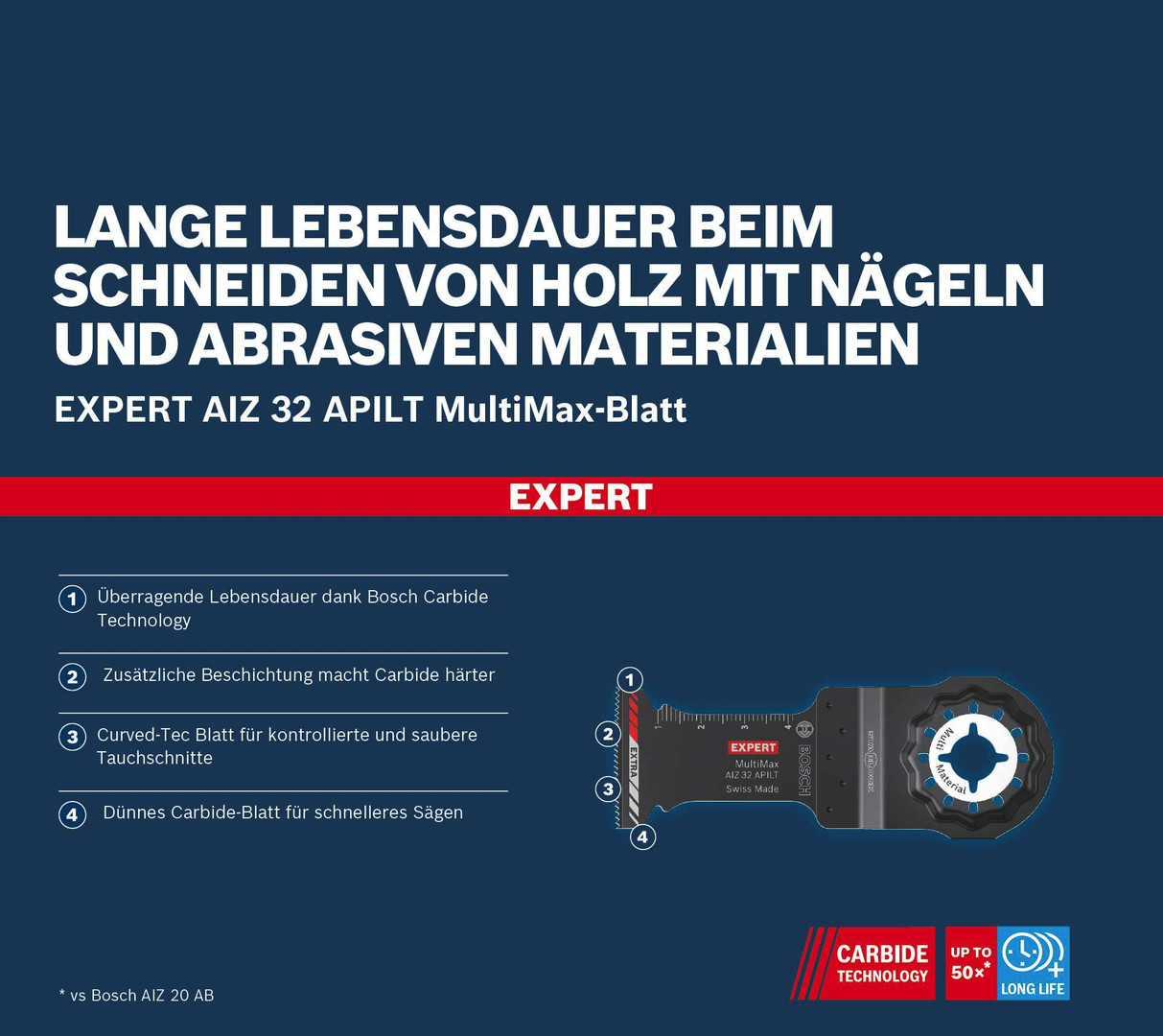 Lange Lebensdauer beim Schneiden von Holz mit Nägeln und abrasiven Materialien! Zusätzliche Beschichtung macht Carbide härter Ein Blatt für Multifunktionswerkzeuge, mit dem du hervorragende Schnitte in verschiedensten Materialien machen kannst, erleichtert das Arbeiten erheblich. Darum haben wir das EXPERT AIZ 32 APILT MultiMax-Tauchsägeblatt entwickelt. Mit ihm kannst du präzise Schnitte und Tauchschnitte in Holz mit Nägeln, Ziegelstein und andere Verbundwerkstoffe und abrasive Materialien machen effizient und mühelos. Das dünne, lange Blatt des EXPERT AIZ 32 APILT MultiMax-Blatts ist außergewöhnlich langlebig und ermöglicht Tauchschnitte mit einer Tiefe von bis zu 45 mm. Die konischen Carbide-Zähne mit dem innovativen Curved-Tec-Profil sind robust und scharf. Sie sind dafür ausgelegt, Späne effizient zu entfernen und Hitzeverfärbungen zu reduzieren insbesondere beim Schneiden in Holz. Überragende Lebensdauer dank Bosch Carbide Technology