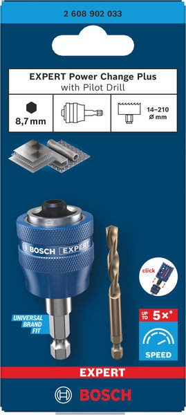 Mit hoher Geschwindigkeit wechselnde Lochsägen und Bohrer! Kann mit einem kompletten Sortiment an Lochsägen genutzt werden Das Anbringen des Zentrierbohrers an den Adapter war schon immer eine schwierige Aufgabe. Dies kostet Profis Zeit und Geld. Mit dem EXPERT Power Change Plus kannst du dank dem cleveren Ein-Klick-Adapter von Bosch innerhalb von Sekunden die Zentrierbohrer wechseln. Das Bosch EXPERT Power Change Plus Lochsägensystem wurde entwickelt, um Benutzern von Lochsägen die beste Verbindung mit maximaler Effizienz zu bieten. Dies spart Ihnen Zeit und hilft Ihnen, auch die schwierigsten Aufgaben mühelos zu erledigen. Maximale Effizienz mit dem Quick Change-System von Bosch