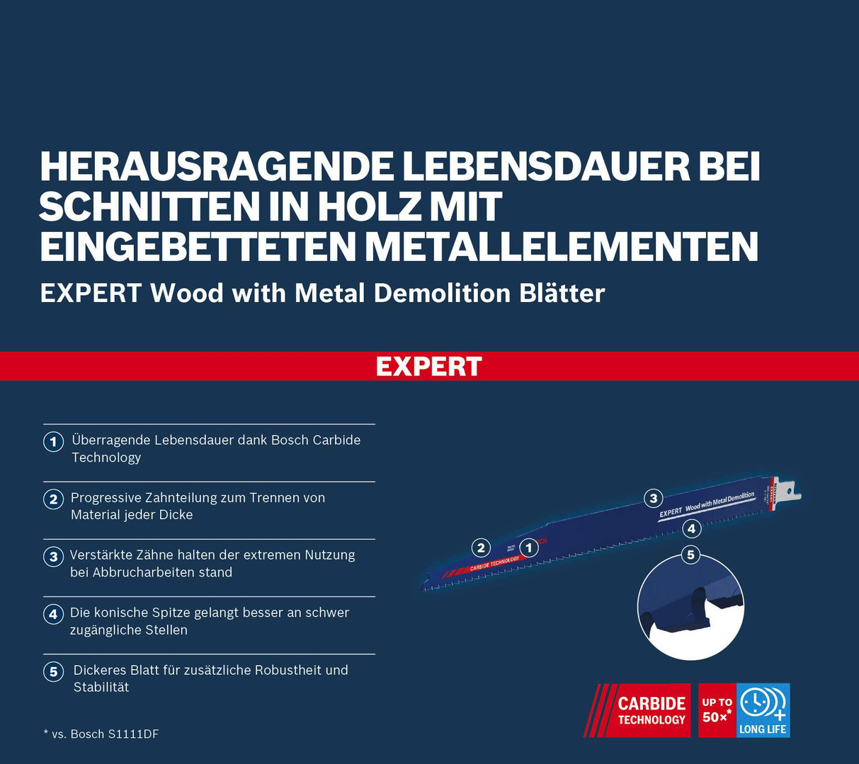Herausragende Lebensdauer bei Schnitten in Holz mit eingebetteten Metallelementen! Progressive Zahnteilung zum Trennen von Material jeder Dicke Was ist noch härter als ein Bosch-Carbide-Blatt? Natürlich eine Bosch-Carbide-Blatt mit verstärkten Zähnen! Manchmal werden Blätter bei Abrissarbeiten so stark beansprucht, dass die Zähne abgerissen werden. Also hat Bosch sie noch stärker gemacht. Wenn du wirklich die robustesten Strukturen und Beschläge zerlegen musst, ist das Bosch EXPERT Wood with Metal Demolition-Säbelsägeblatt genau das Richtige für dich. Es lässt sich auch durch härteste Einsätze nicht aufhalten und schneidet einfach weiter. Überragende Lebensdauer dank Bosch Carbide Technology