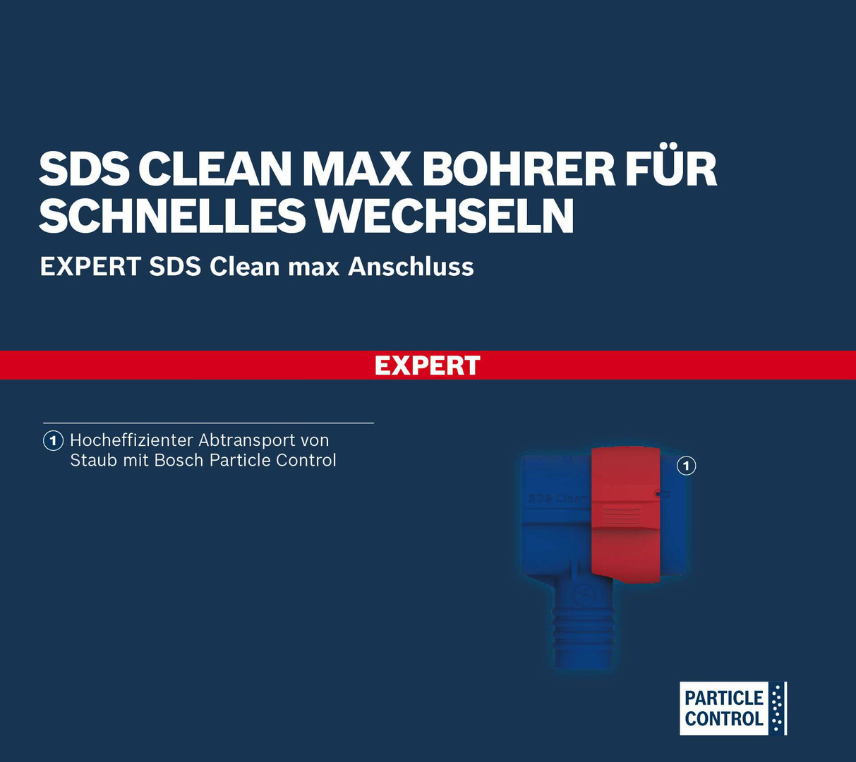 SDS Clean max Bohrer für schnelles Wechseln! Auch beim staubfreien Bohren von Löchern für Dübel möchtest du die Bohrer schnell wechseln können. Wir haben den EXPERT SDS Clean max Anschluss so entworfen, dass dies möglich ist. Der Anschluss passt auf alle EXPERT SDS Clean max Bohrer und ermöglicht den Austausch abgenutzter Bohrer mit wenigen Klicks. So kannst du deine Bohrarbeiten schneller erledigen, bohrst saubere Löcher und hast weniger Staub in deiner Atemluft. Der EXPERT SDS Clean max Anschluss macht Bohren in Beton einfacher. Das Einsetzen und Entfernen der EXPERT SDS Clean plus Bohrer ist schnell und unkompliziert. Der Anschluss funktioniert mit den meisten Staubabsaugungen. Er hat eine lange Lebensdauer (ca. 5x die länger als die eines Bohrers), ist dabei aber kompakt und klein, beansprucht also nur wenig Platz im Werkzeugkasten. Hocheffizienter Abtransport von Staub mit Bosch Particle Control