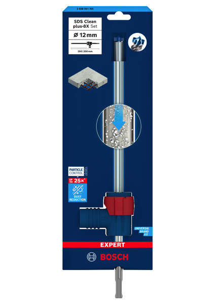 Bohren in Stahlbeton mit verbesserter Staubreduzierung! Durchdringt Stahlbeton mit einem Voll-Carbide-Kopf mit 4 Schneidern Das Bohren präziser Löcher in Beton ist nur ein Schritt bei der Installation chemischer Dübel. Der nächste Schritt besteht in zeitraubenden Reinigungsarbeiten. Mit dem EXPERT SDS Clean plus-8X wird alles anders. Das System bohrt Löcher und entfernt gleichzeitig Staub. Das beschleunigt und vereinfacht die Installation chemischer Dübel. Wir haben das EXPERT SDS Clean plus-8X Set für Bauarbeiter und Installateure entwickelt, die Löcher für chemische Dübel bohren müssen. Der Bohrer ist mit einem 4-Schneider-Vollhartmetallkopf und einem robusten Staubsaugerrohr ausgestattet. Zudem haben wir den SDS Clean plus Anschluss verbaut, der für alle SDS Clean plus-8X Bohrer geeignet ist und sich leicht montieren und abnehmen lässt. Du erhältst also einen leistungsstarken Bohrer, der bei Verstopfung leicht zu reinigen ist (einfach das Absaugrohr vom Bohrer abnehmen) sowie eine neue Technologie zur Staubreduzierung, mit der du Löcher für chemische Dübel schneller vorbereiten kannst. Zudem ist die Luft am Arbeitsplatz sauberer. Alles mit nur einem Zubehör. Hocheffizienter Abtransport von Staub mit Bosch Particle Control